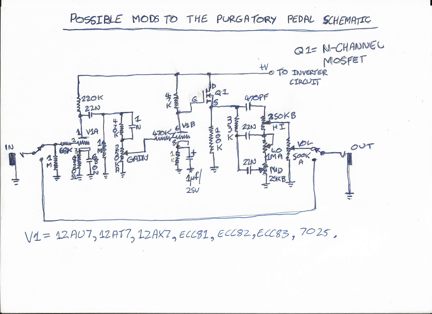 Just been working on drawing-up a version of the Purgatory pedal schematic with some mods that are worth trying, going to scan it into my computer using the scan function of my new HP printer I bought recently, once it's posted I'll explain the mods I did to the circuit.