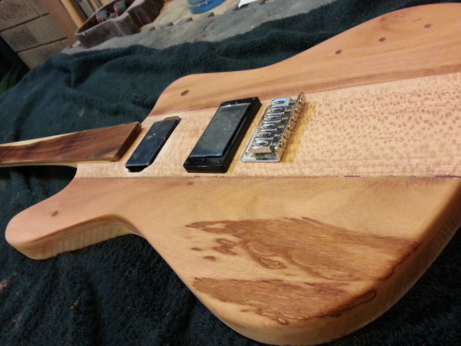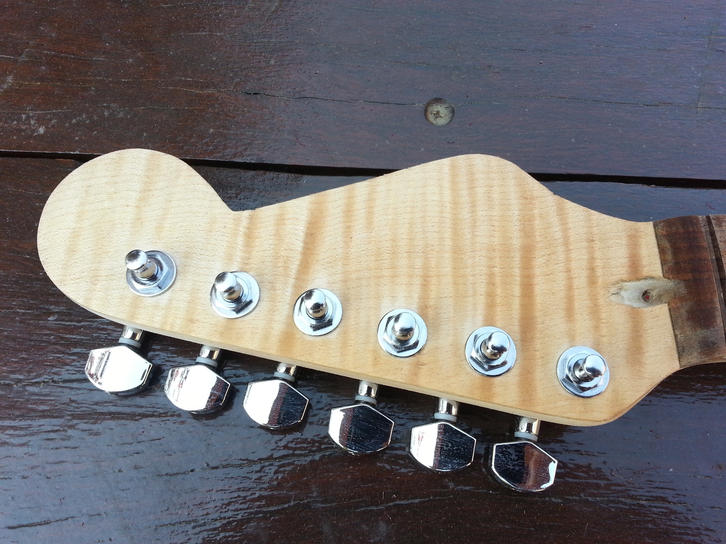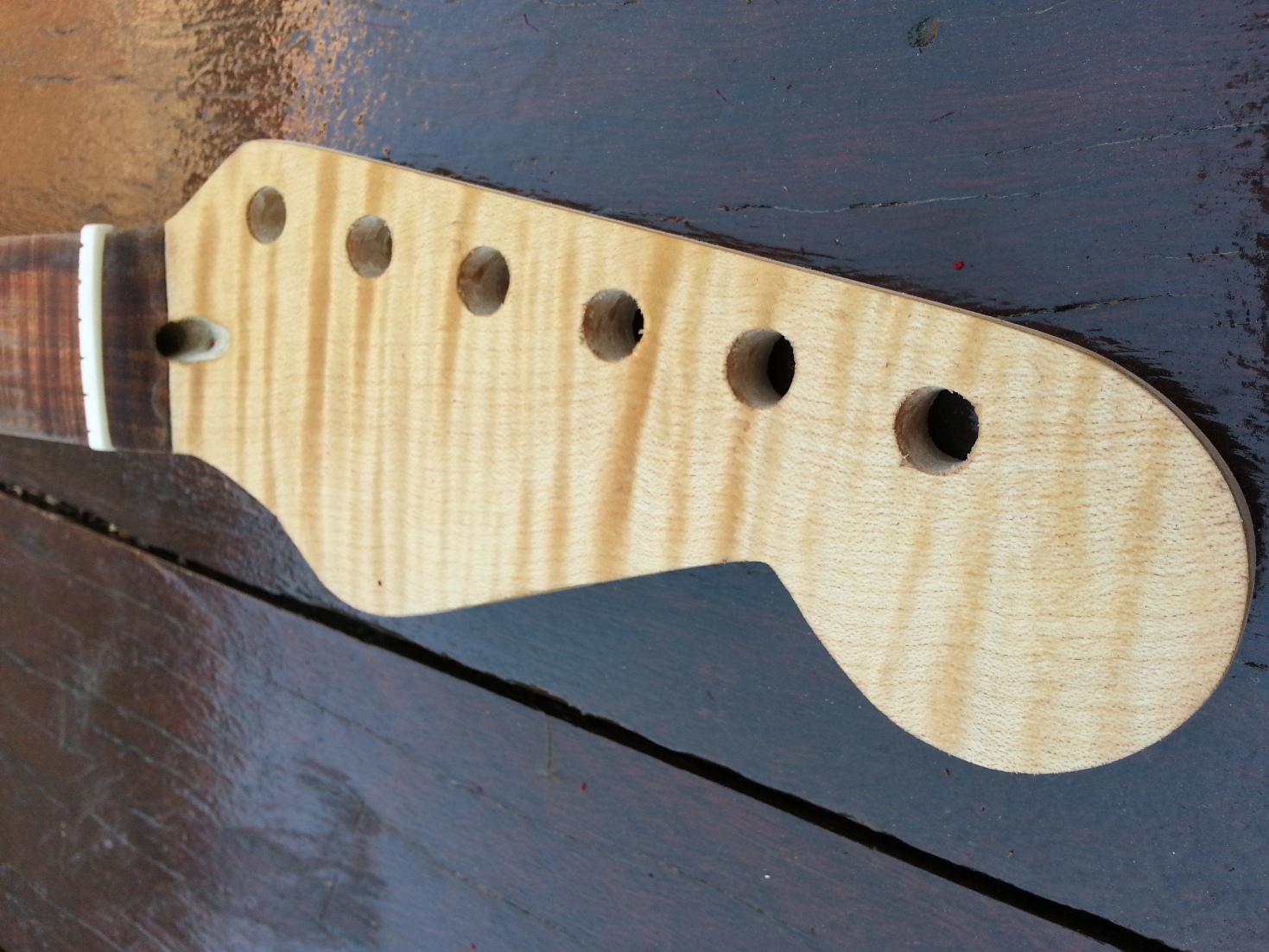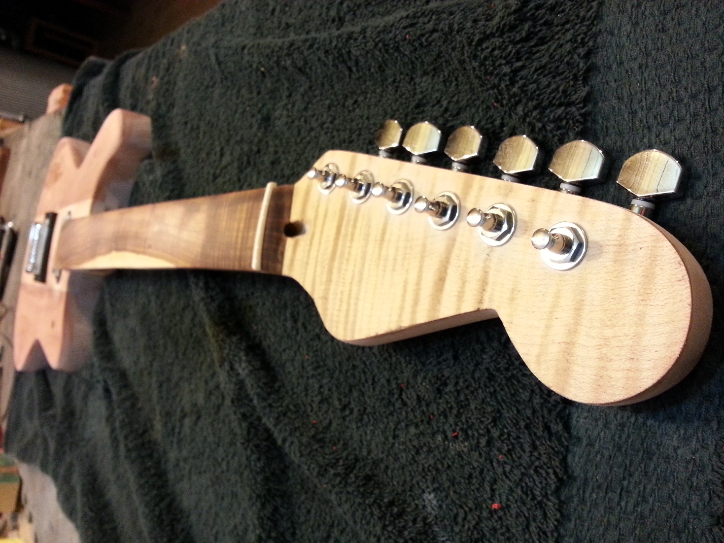 on Friday myself and DB went visited our mate the Timber Bloke and got some nice tiger maple and walnut veneers. This is how the tiger maple looks on the headstock