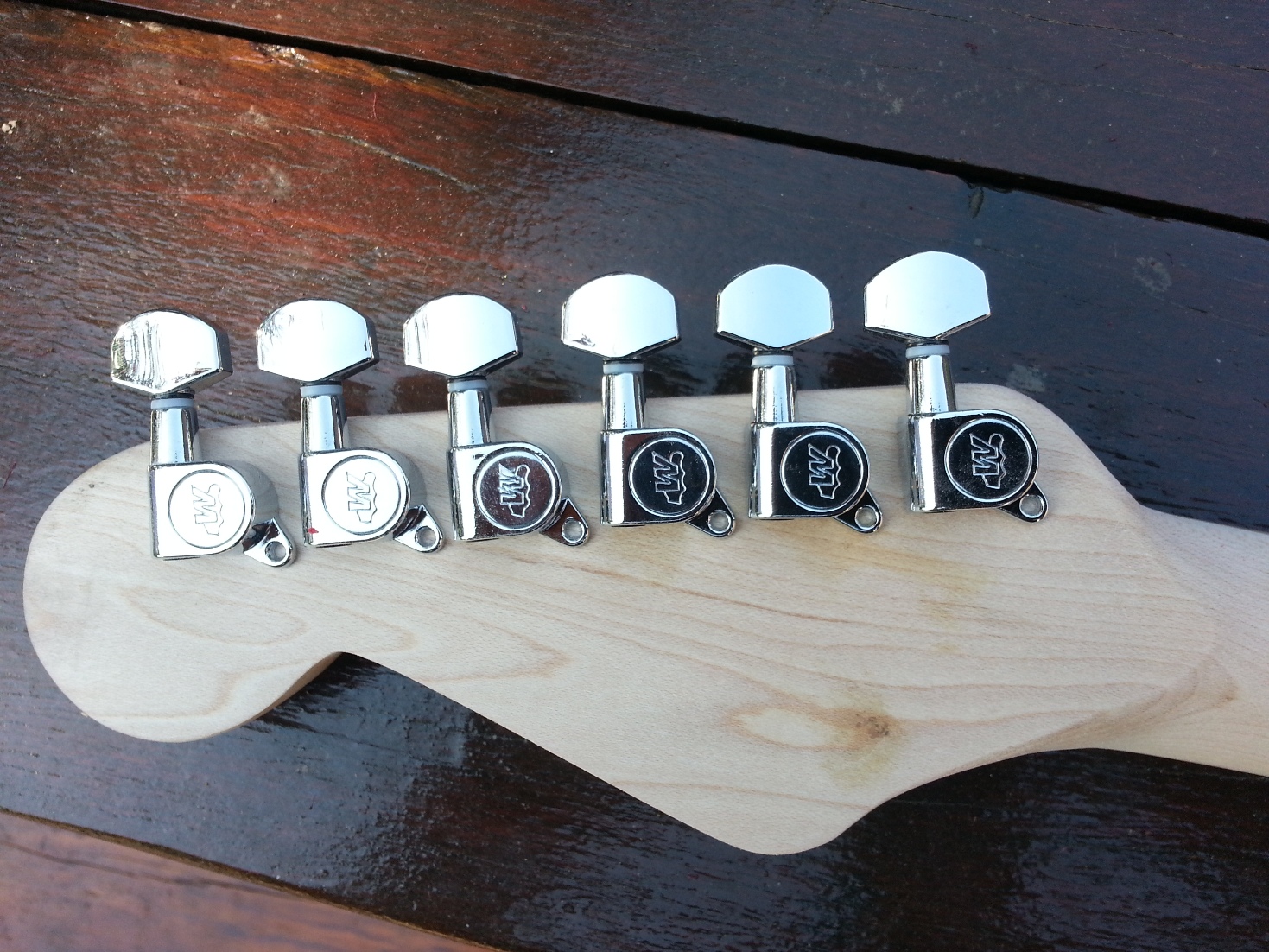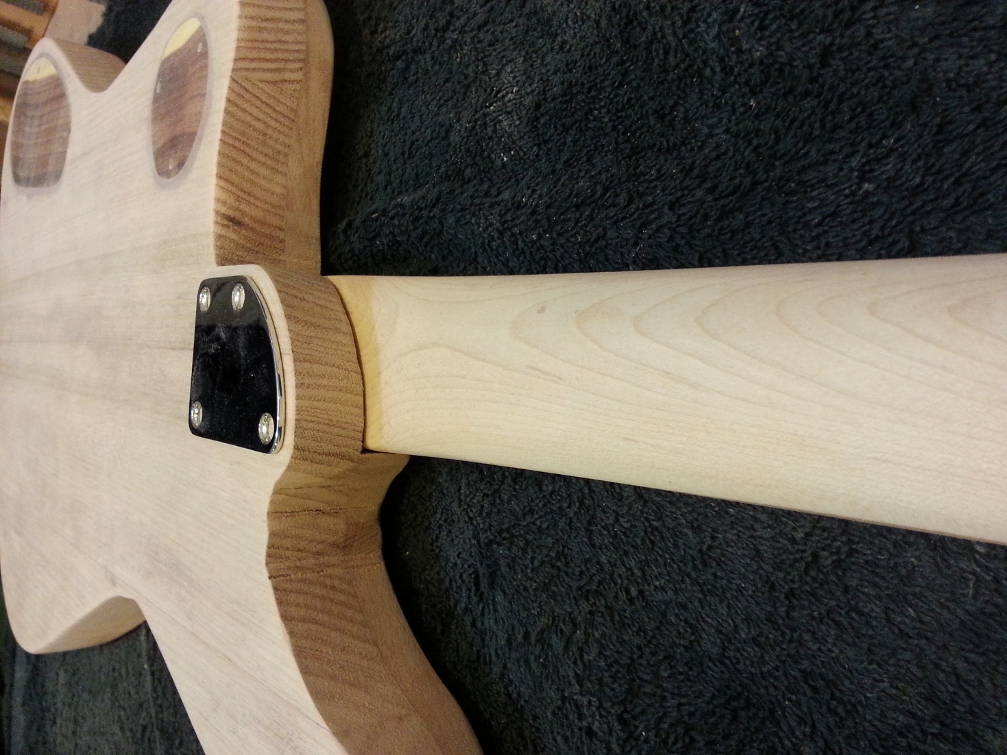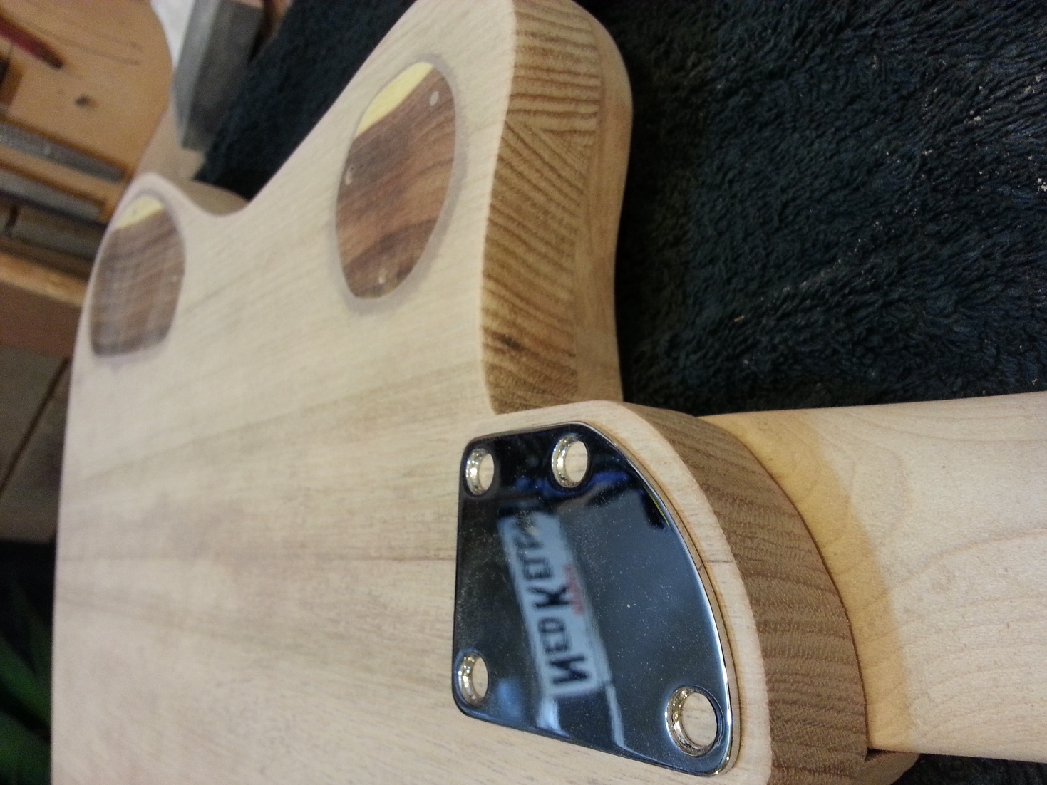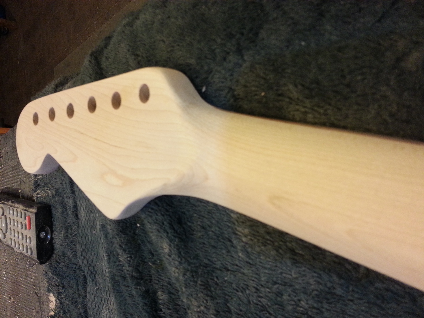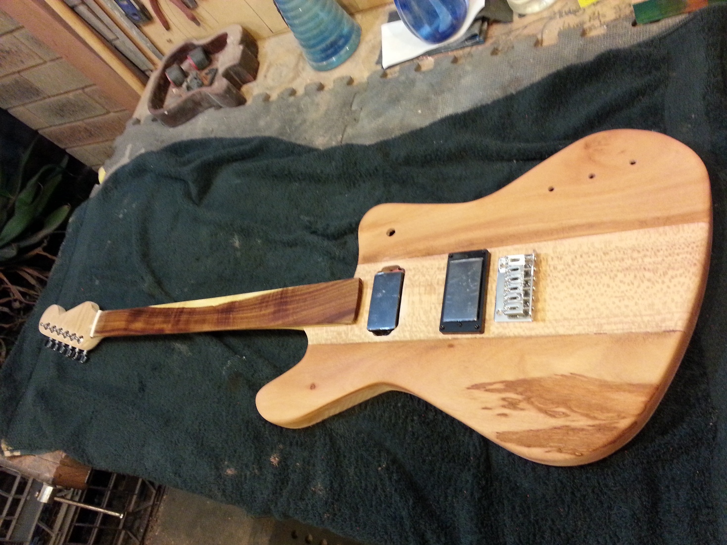 on Friday myself and DB went visited our mate the Timber Bloke and got some nice tiger maple and walnut veneers. This is how the tiger maple looks on the headstock