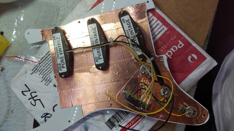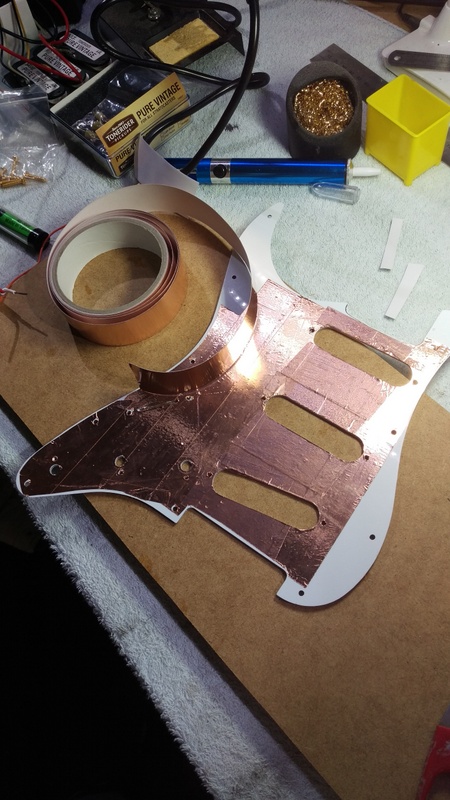 I removed everything from the pickguard first, and applied copper tape everywhere: