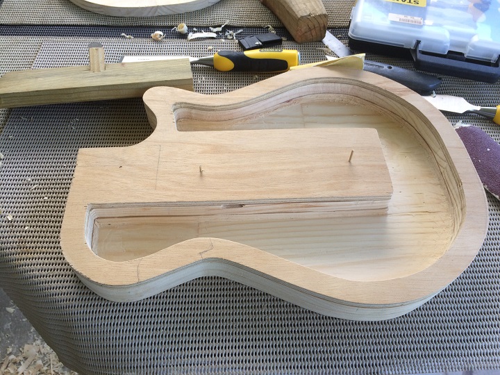 Next job is to make sure that I have all the internal routing for the wiring figured out and the cut-away for the piezo control unit sorted. The piezo is for an acoustic guitar so it is a bit tricky to mount into the solid part of the body. Once the body is glued together it will be hard to work on, so I have to make sure I have not forgotten anything.