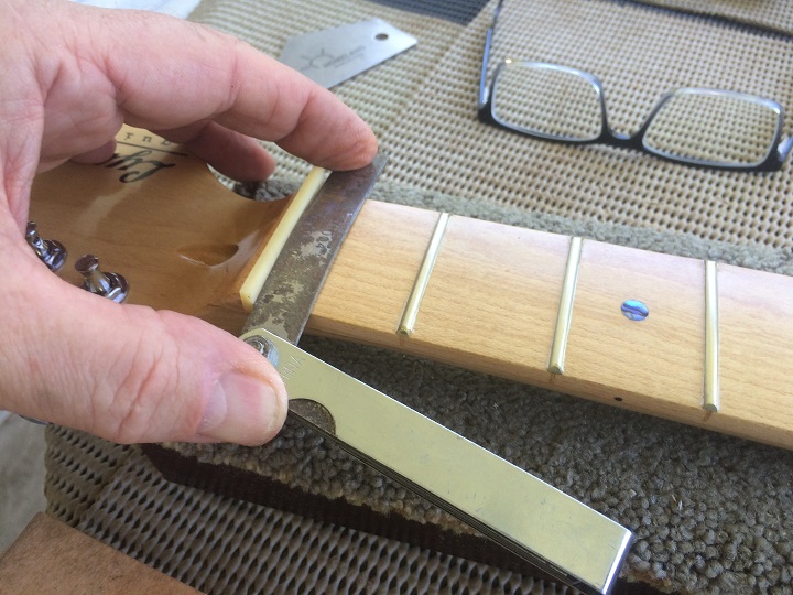The final step is probably the most tedious. This is where the final adjustments are made. This is done with nut in place and the strings on the guitar.