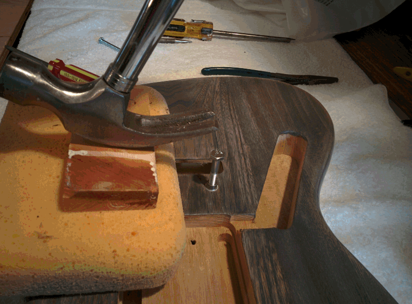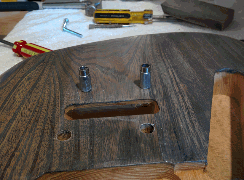 I have now finished the body with 5-6 coats of a water based semi-gloss finish. The bridge has been installed and the neck bolted on. I have also put the copper shielding in.