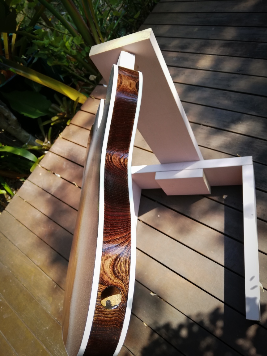 Choosing to leave out the pickguard has present some challenges, first with the pick up, then with a little high spot in the veneer.