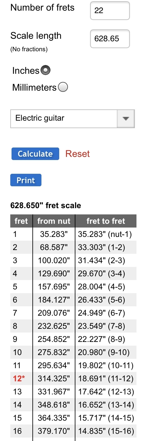 From the fretboard edge of the nut, it should be 1/2 of 24.75” or 1/2 of 628.65 mm to the center of the 12th fret which is 314.3 mm. Mine is 312mm. I understand I can move the neck such that the overall scale length is 628.5mm. If I do that, I’d need to adjust the saddles in a bit to get proper intonation. The result would be scale length technically a little short of 628.5 mm. But if I do that, it seems like every other note will technically be out of tune.