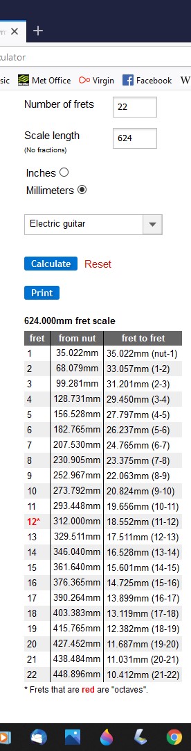 There are fret spacing tools/calculators. Here’s a pic of one from Stewmac. If I were building your own guitar and cutting frets, this would be my guide. This says from the fretboard edge to the center of the 1st fret should be 35.28 mm. My neck measures short of 34 mm. However all the other center-to-center fret spacings are pretty much spot on. Since every fret is in the right place relative to each other, but the nut is not in the right place relative to the 1st fret, it seems like gluing my neck based on the position of the first fret isn’t the best idea.