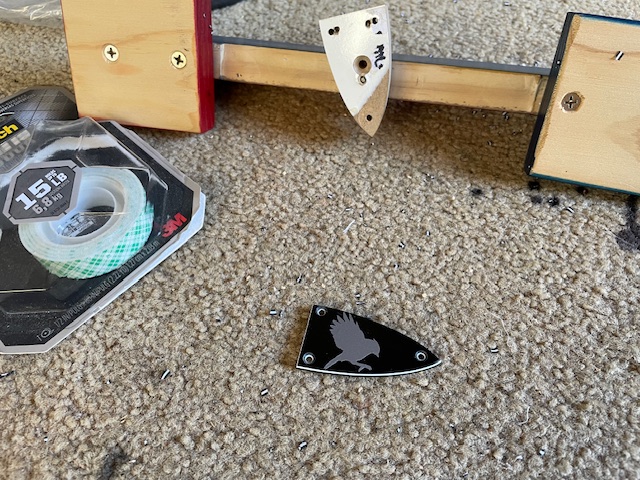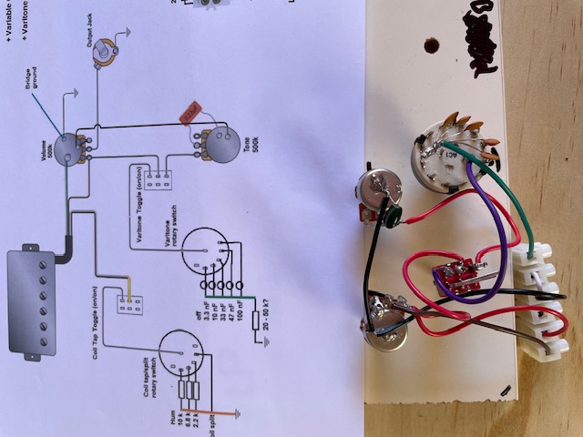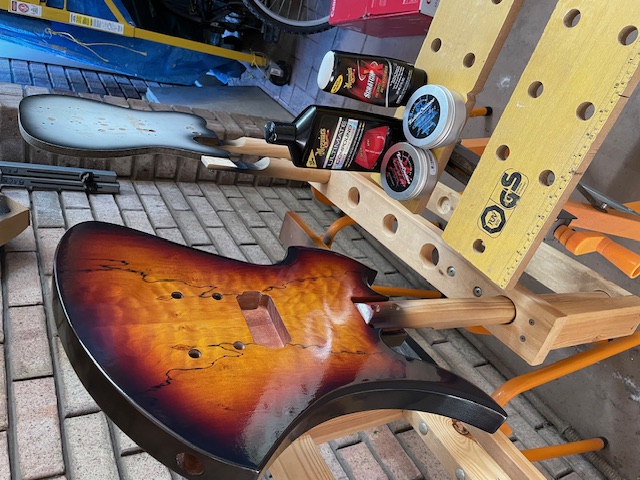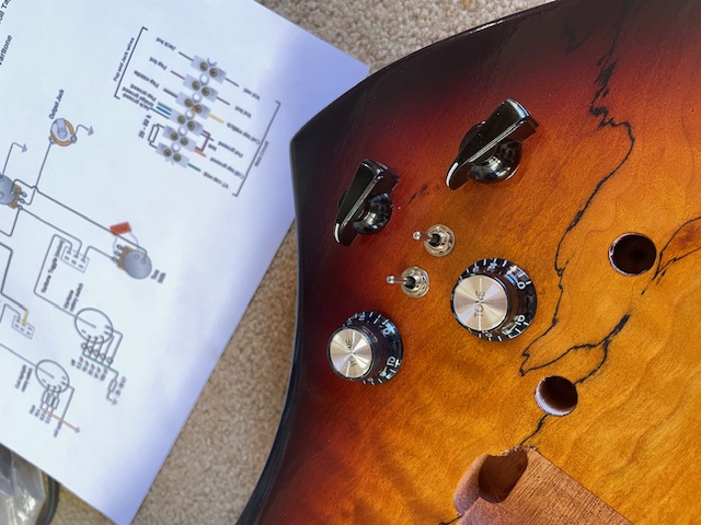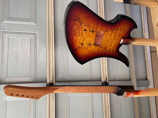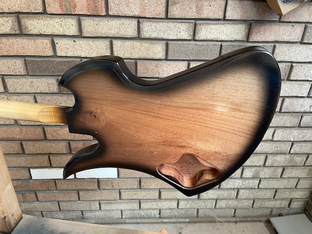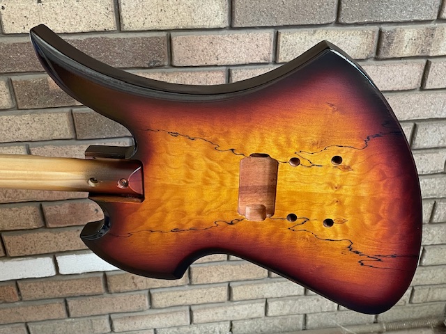 I managed to purchase the Custom MBM-1 from the specials last week. Mahogany body and neck with a Spalted Maple veneer, reverse hockey stick headstock, and no fret markers. The kit arrived with no hardware - but Adam has since delivered a black hardware pack (thankyou).