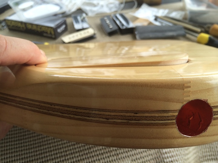 Pic 3. Starting the P90 cavity. For the small drilling jobs I used an "egg beater" drill for the larger holes I used the brace and a spade bit.