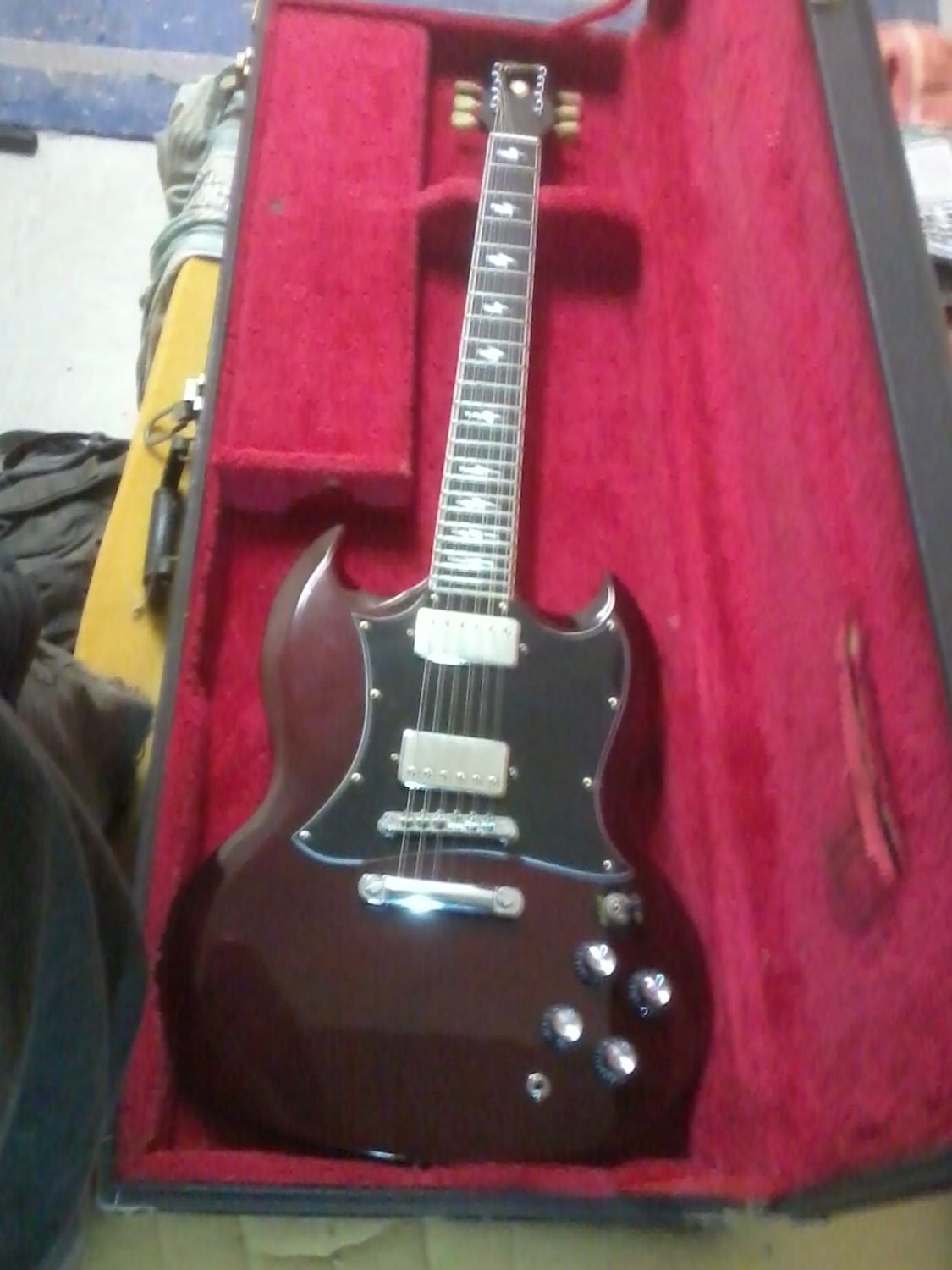 The SG needs a bit of TLC work done on it to fix some fret-buzzing issues at the body end of the neck (the fret responsible seems to have lifted slightly from the edges of the fretboard), the tuners need replacing because they exhibit about 1/4-turn of backlash (I've ordered a set of replacements from Stewmac), and the nut needs replacing because the open high e-string buzzes like a sitar a bit (I'd like to replace the original plastic Corian nut with a bone nut), I've also ordered a Nashville Tune-O-Matic bridge to replace the original ABR-1 bridge as well.
