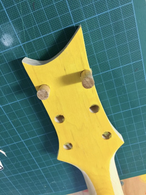 As predicted by Simon and others, the holes on the headstock became very close to the edge once I'd got to the shape I wanted. I plugged the top two with dowel and re-drilled.