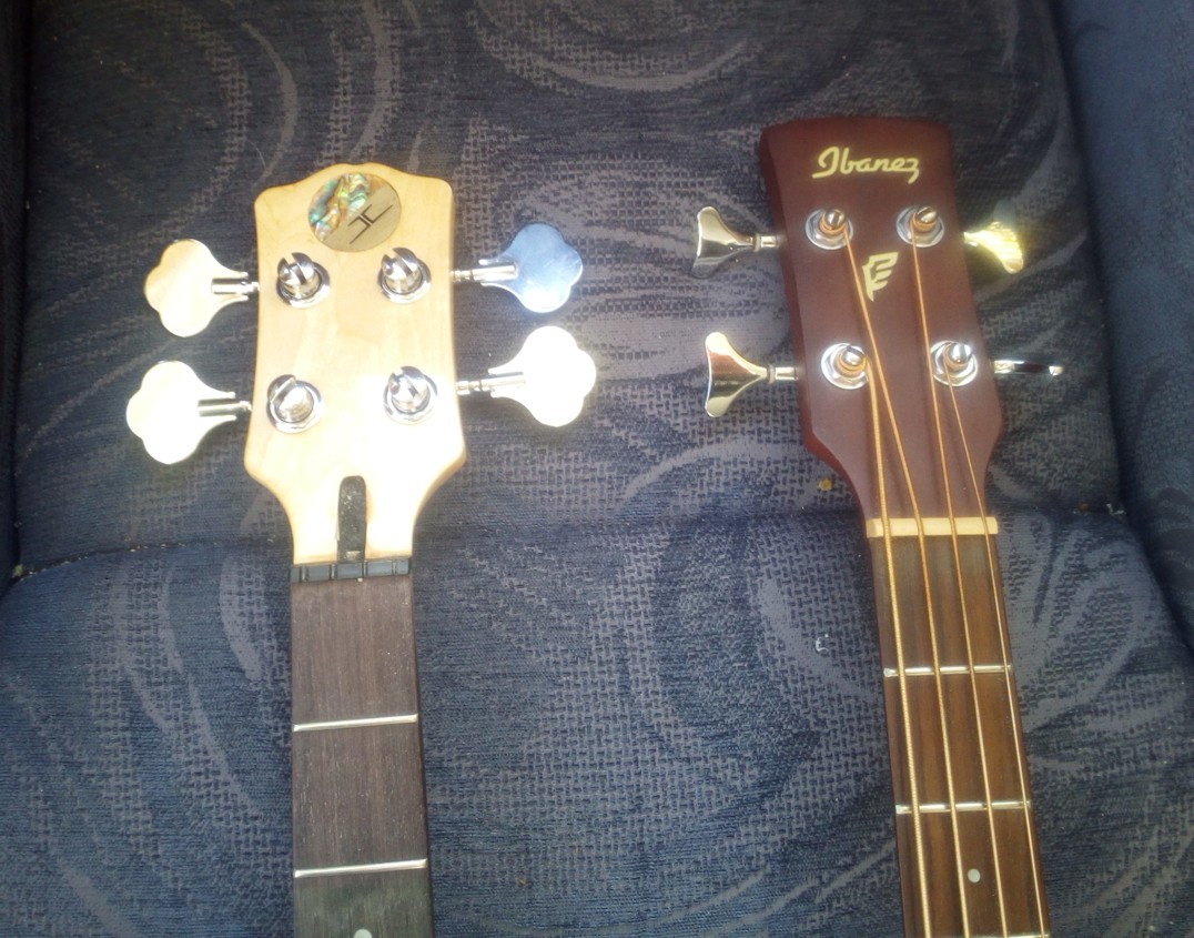 Here's a comparison between the ESB and my Ibanez acoustic. I maintain the small tuners look far better, but although its not a high priority personally, I need to recognise that its likely the majority of kit builders will wish to maintain the general style of the instruments that inspired each kit design. The same, I guess, applies to the 3 point bridge against a trapeze tailpiece or string through setup, now I think about it.
