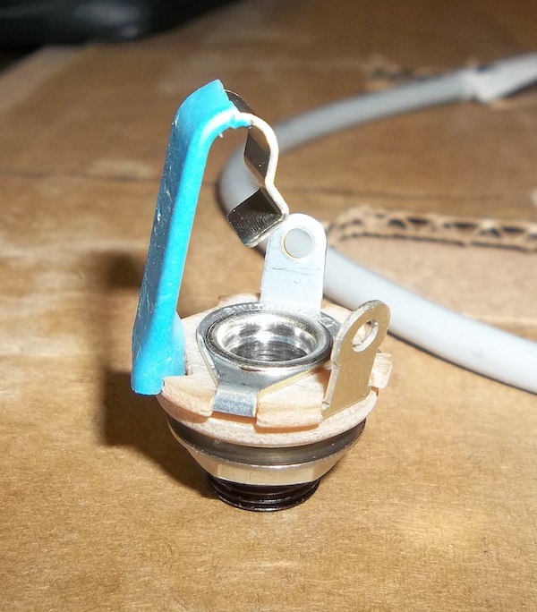 Resolder the wires and re-shield the bits I had scraped away in the cavities. Turn the jack socket 1/4 turn...and re-insert into the body.