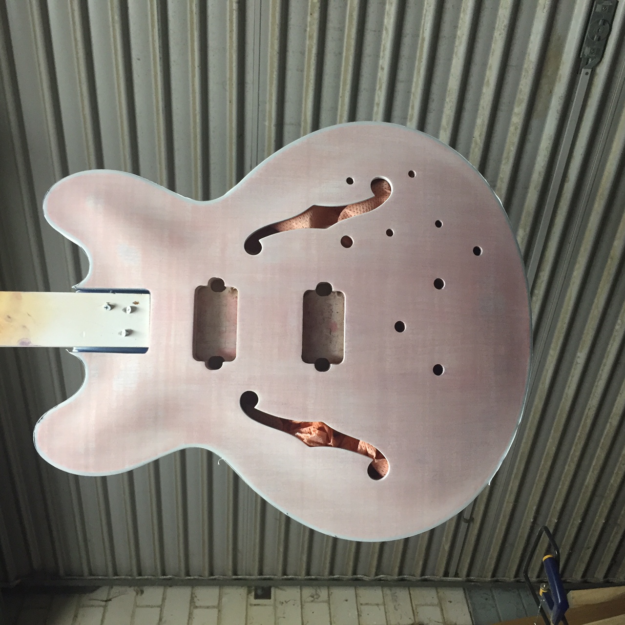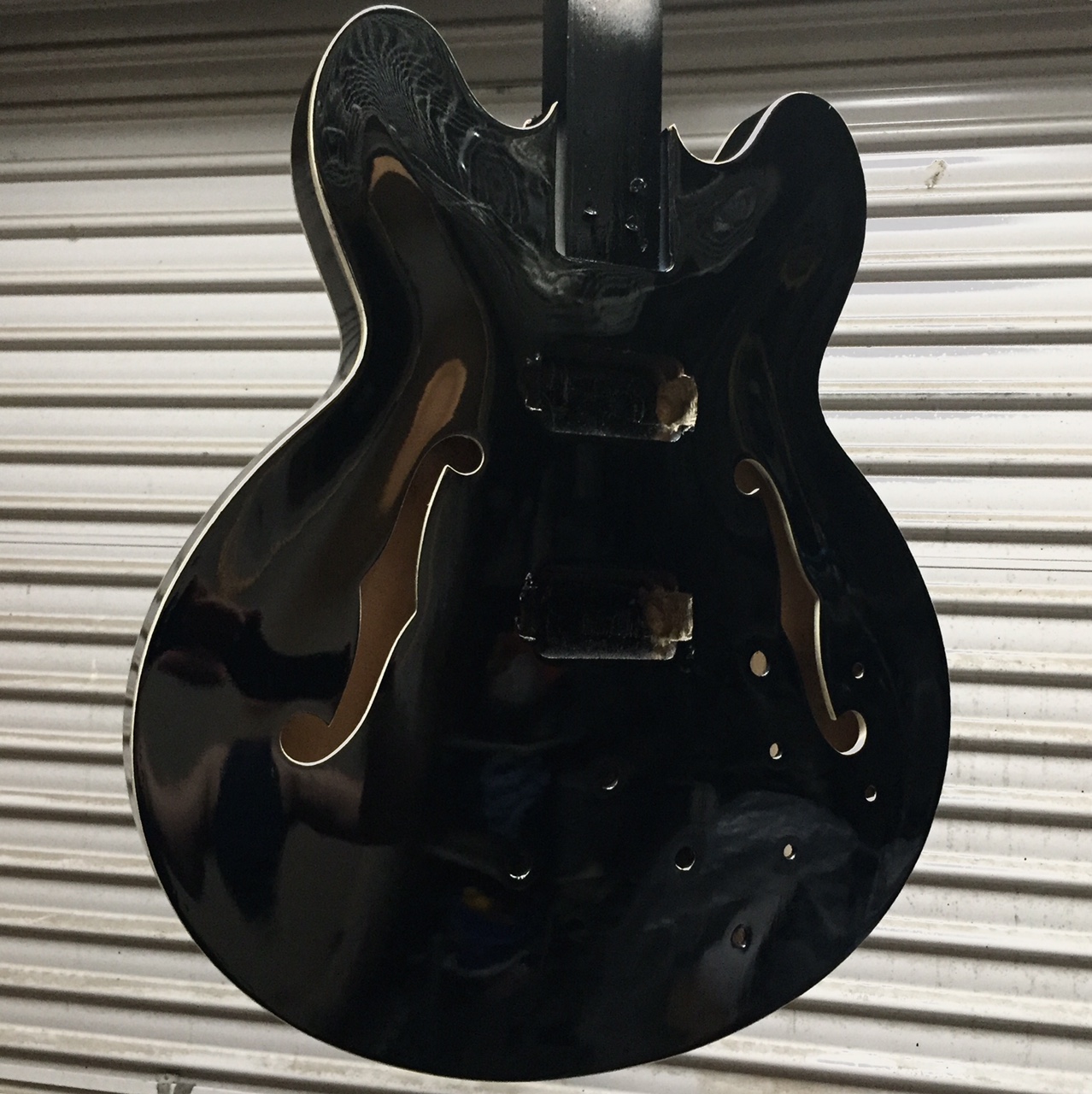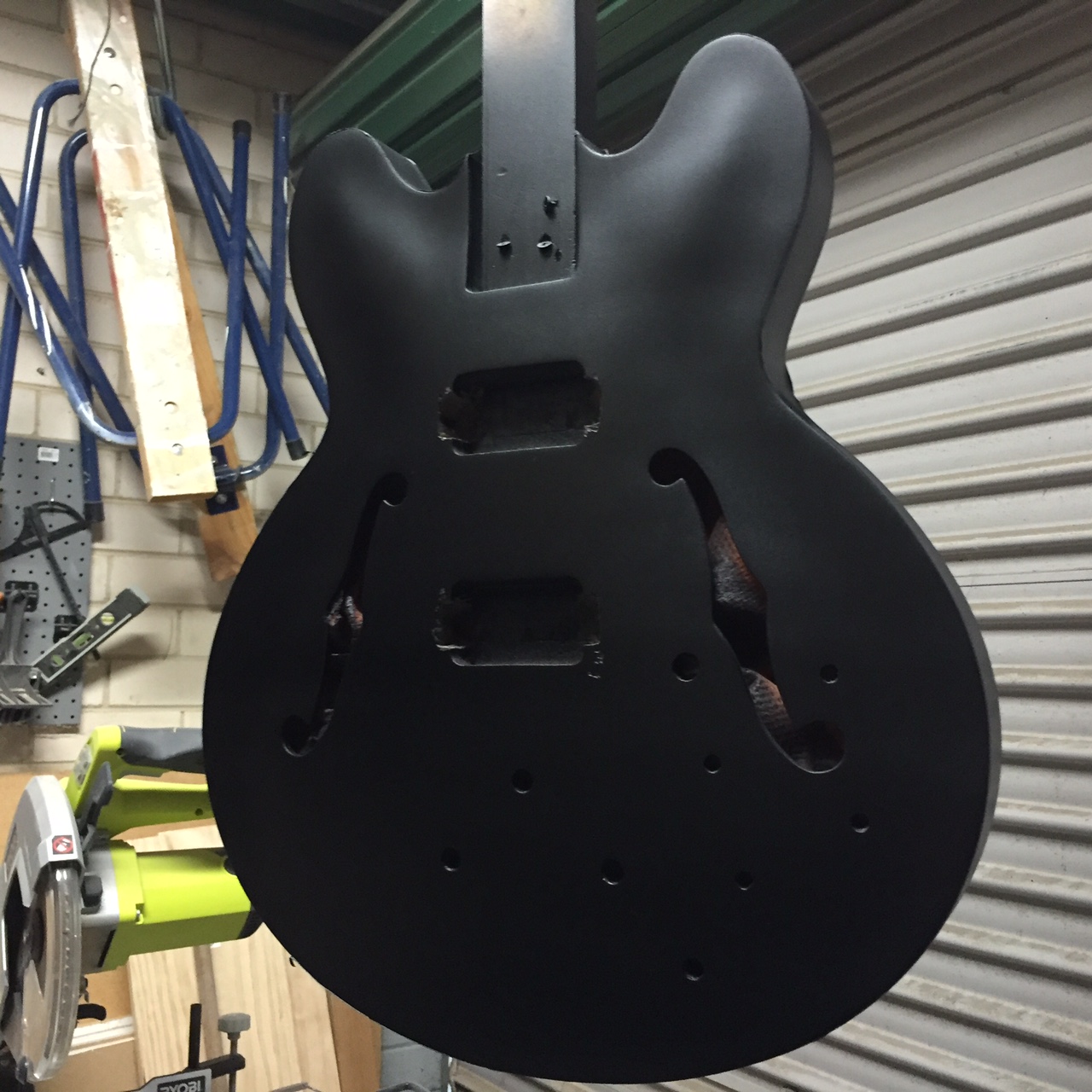 After much thought I decided that the only way forward was to paint a solid colour because any more sanding and I would’ve ended up with a pile of sawdust and a fretboard. Going back over the guitars I’ve loved over the years black Gibsons have been high on my list. Did a lot of reading and watched many tutorials about rattle/spray can paint jobs.