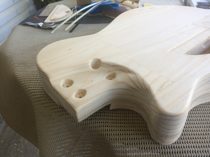 I thought it would be easier to give the individual pieces a rough shape before gluing. It also gave me the opportunity so rebate the centre strip of ply for the truss rod channel.