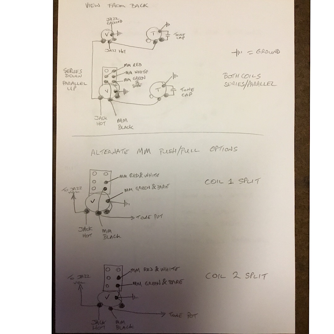 Top diagram on this is the overall 2V 2T layout with the push/pull set up to switch both MM coils between series and parallel. Below that are alternative push/pull configs to switch from series to split coil 1 or coil 2 (one of the split coils will hum cancel with the Jazz the other won’t, you’ll need to test to see which is which).