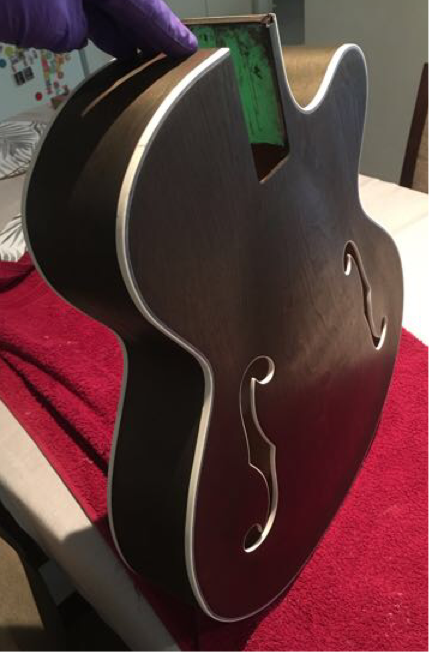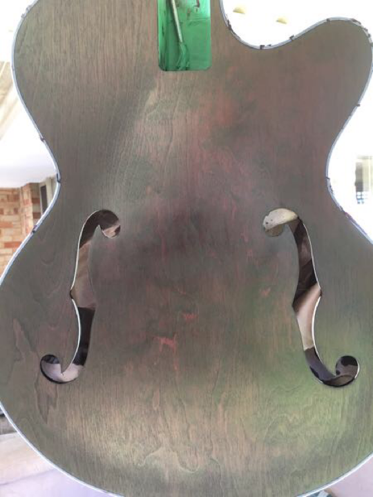 I was scraping binding last night (The masking had done it’s job well) when I noticed the tide line? On the middle side of the right f hole. So I re-masked the binding, wiped the face with metho and re-stained this morning before work. Looks much more even. However, a lot more stain got onto the binding this time. The price I pay for not getting it right the first time.