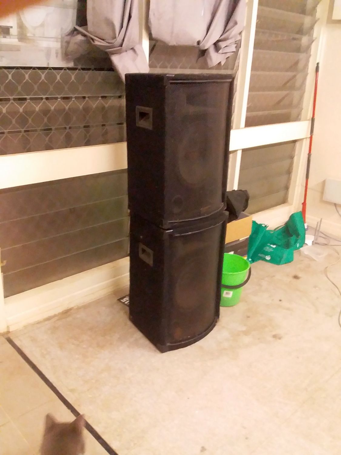 The two 8 Ohm 400 Watt Precision Audio PA speakers stacked one on top of the other.