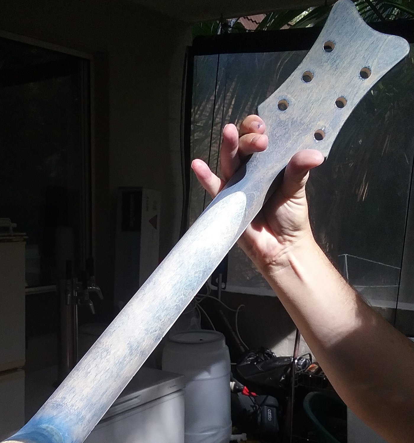So I commenced sanding the neck and body this month (Jan 2020) after having resigned myself to zero decoration -- no, not decorated with "zeroes"! -- and deciding upon the "Bondi Blue" stain kit from Dingotone. Real progress at last. I used 360 grit wet'n'dry, but also 1200 grit to smooth it somewhat prior to staining. Let me (kindly) know if using 1200 at this stage was, in general opinions, a twit's approach.