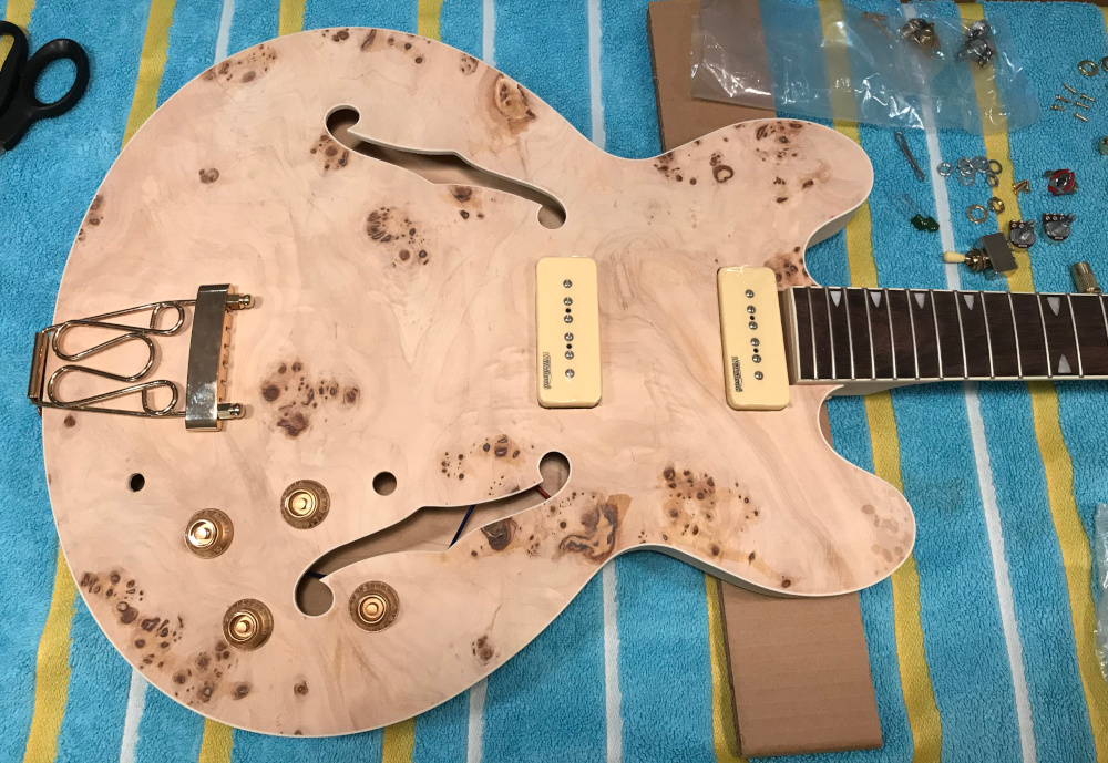 I'm starting out on an ES-335 style build. It's a kit I got from DIY Guitars in Sydney, received this week. So far I'm reasonably pleased with the kit - it's got a lovely burl maple top and back, basswood sides (I think), and a maple neck. It came with gold hardware that seems to be OK, and Wilkinson P90s.
