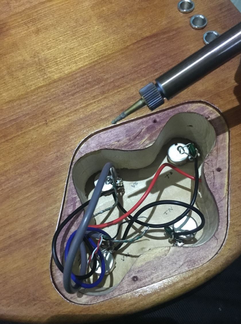 Next stage - wiring! To be honest, this process was initially intimidating as I didn't think I had an electrical mind. Saying that, I watched a load of videos, spoke to some people at the local music shop, and finally worked it all out.
