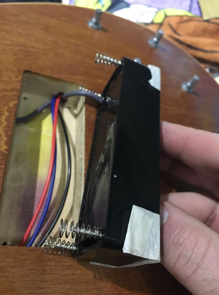 Next step: Installing the Double Bass Humbuckers. Super easy to do as the cavities were already there and the fit was snug. The only tricky thing was getting the screws in the holes without the springs falling off. I taped the screws in place, turned the body at an angle, chucked the springs on (upside down), then pushed them together. That way, I was certain that the springs were in place.