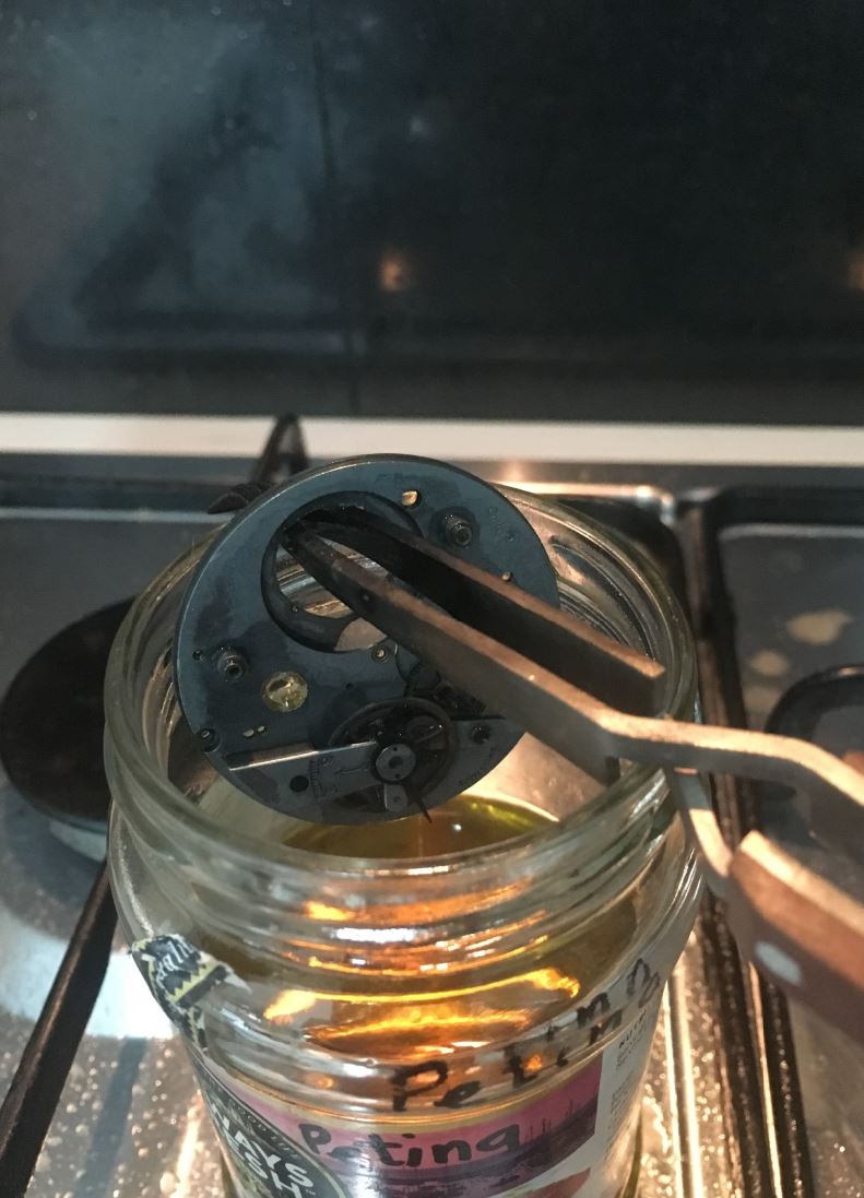 Talking old clock parts, I found this beauty in my collection. Not sure how old it is, but it is the internal body of an old swiss pocket watch. I gave it a clean, then prepared a petina, and soaked it for a little bit. Look how black it came out!!