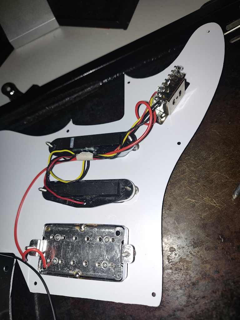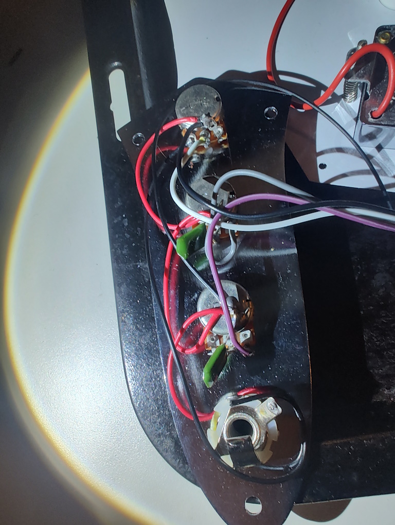 If you have a 7-lug/pad switch it connects as per below. If you have an 8-lug/pad switch then the centre two lugs both connect to the Volume/Switch Output wire.