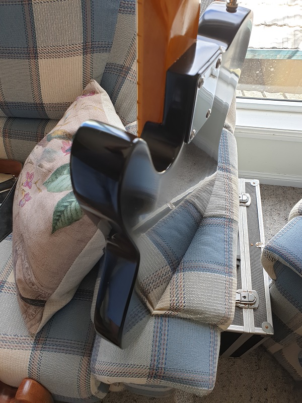 The neck has a good vintage Gibson feel to it. It's quite rounded in feel, but not too chunky and comfortable in the hand. Certainly different to the more ubiquitous modern C-shape that most of the kits have. the fretwork was pretty muck spot on, with no rough fret ends. I did do a token fret level, but it really was minimal and I could have got away with not doing one. The neck joins the body at the 22nd fret, and with the SG cutaways as well, there's certainly no limit to upper fret access. In fact this shifts the neck forward a bit, rather like on a Firebird, one reason that SGs are prone to be neck-heavy. It does mean that the guitar is very long, and you'll need an extra long case to fit it in. I bought a Gator XL ABS case for it which is 4cm longer than standard, and it fits in with 2cm to spare.