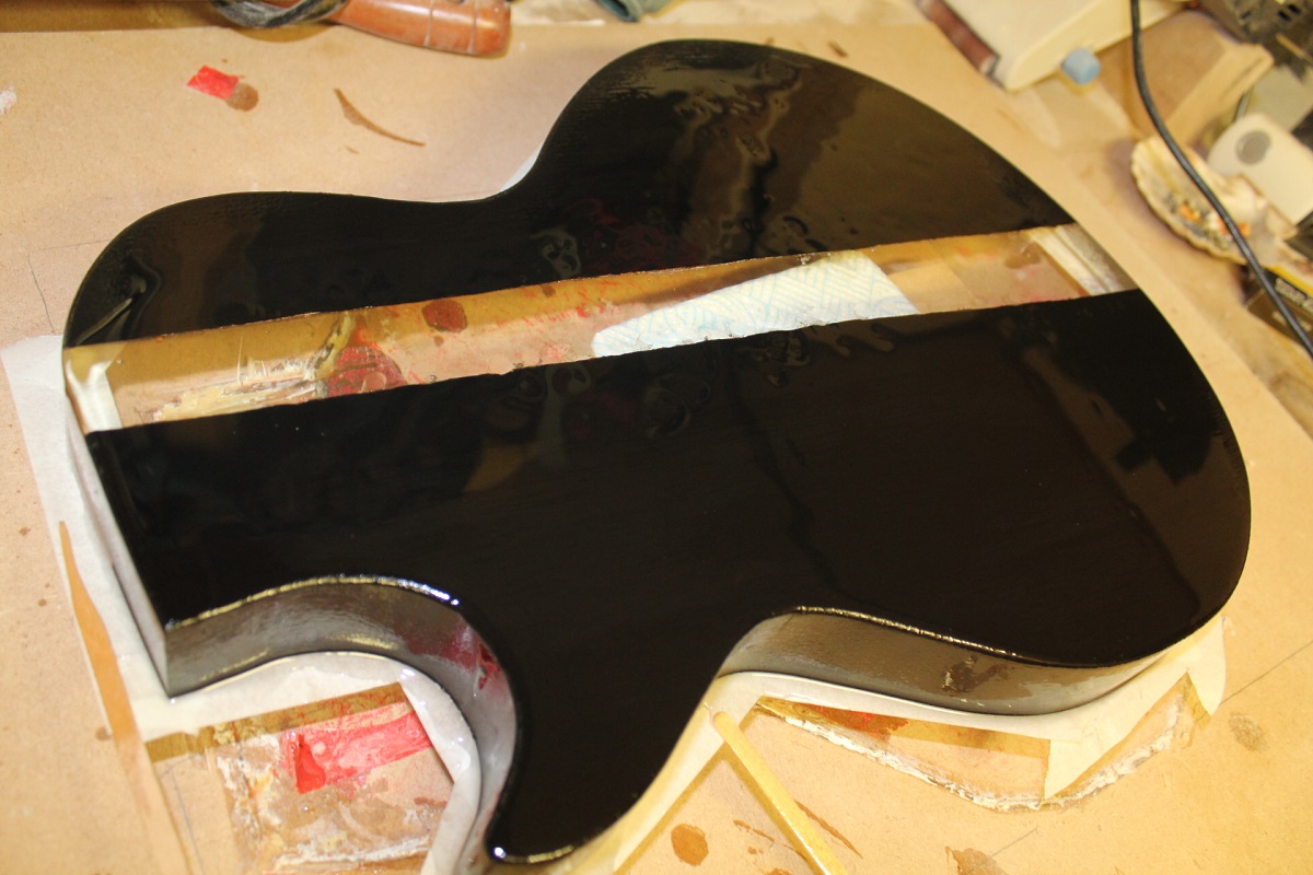 The mould is lined with plastic tape to ensure there are not any leaks and also to make it easy to separate from the guitar body