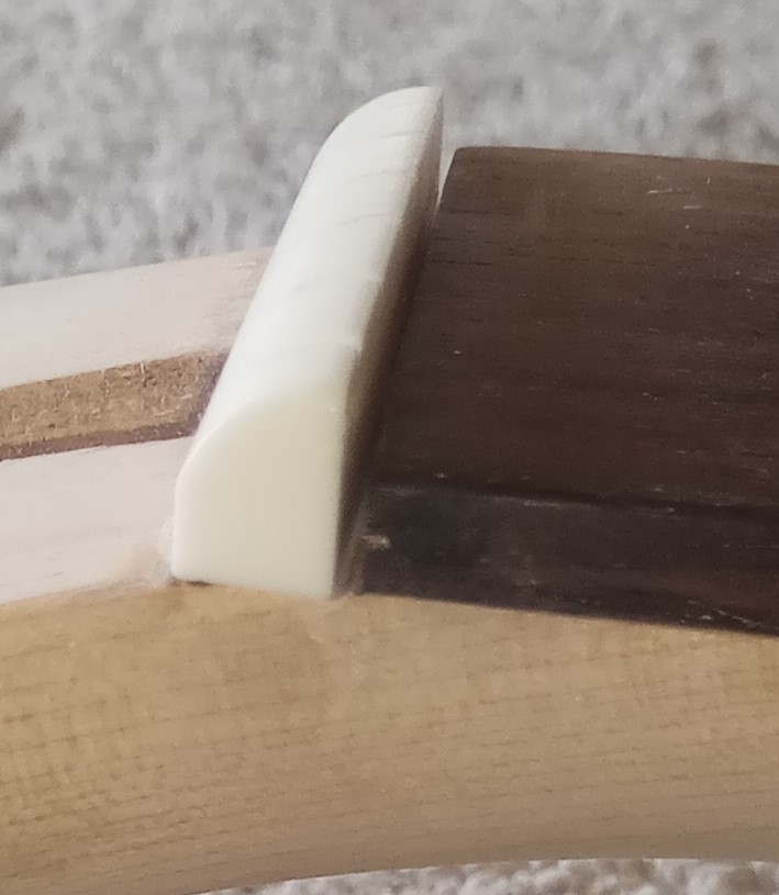 I'm working on a neck from an AG-1 kit and am having some issues with the nut. More specifically, the wood where the nut goes. If I place it flat against the maple, there's a gap between the nut and fretboard. Then if I push it up against the fretboard, there's a gap on the bottom.