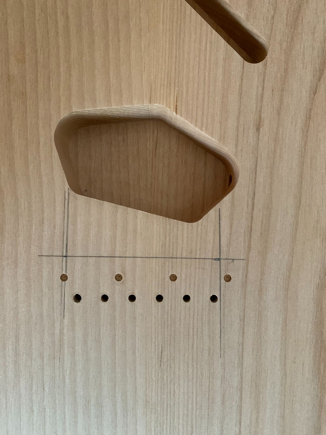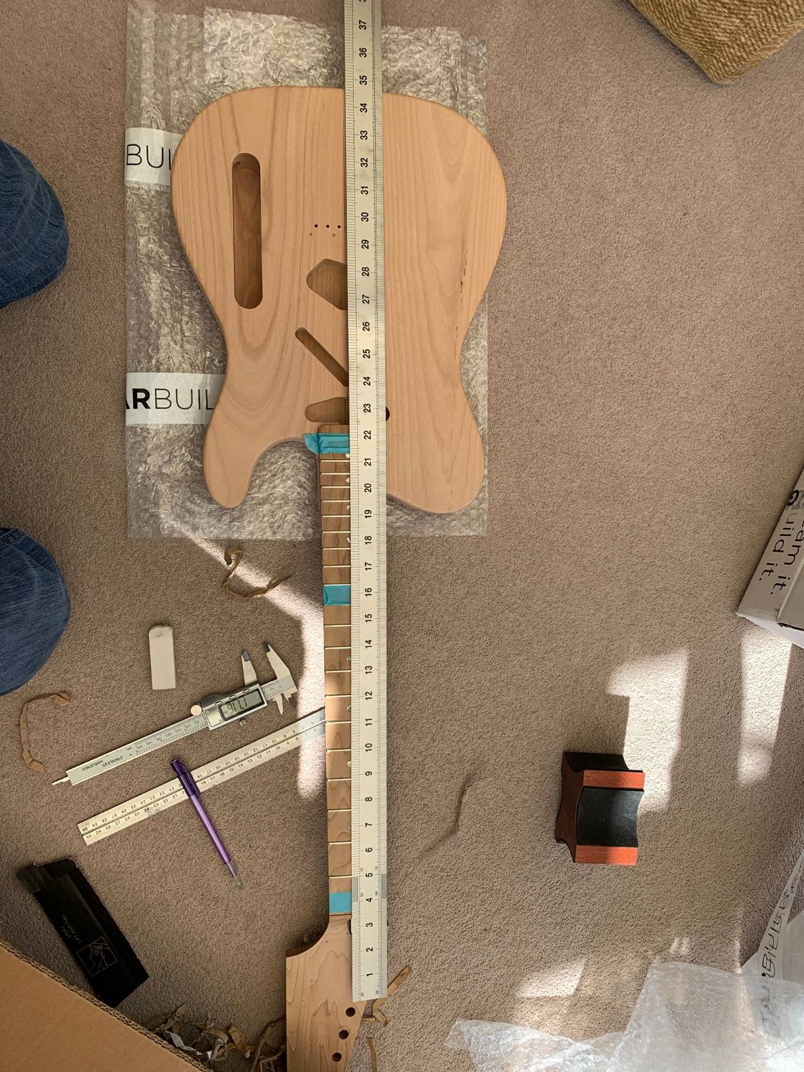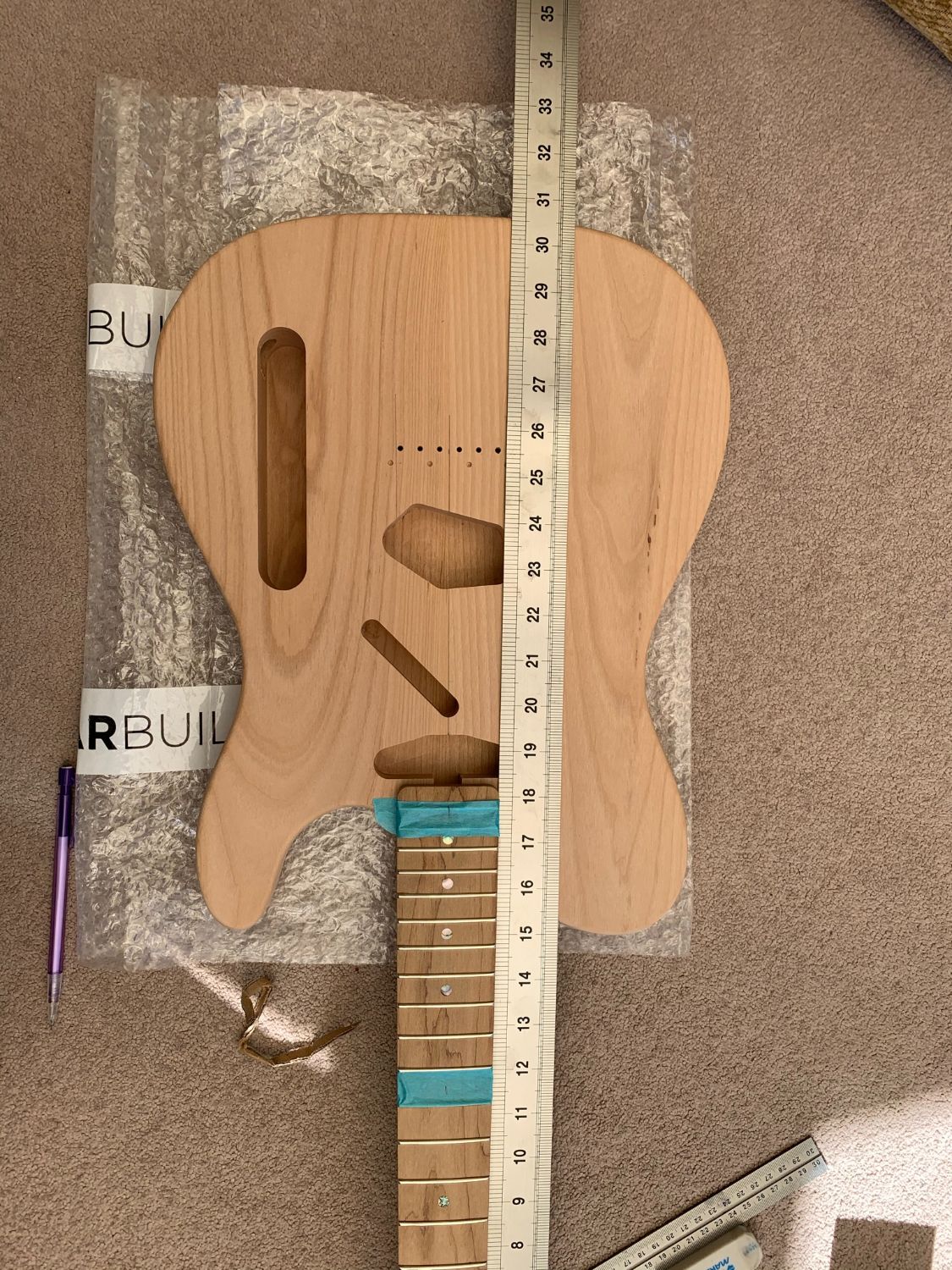 I did my first mock up today. With the bridge lined up on the predrilled holes the E strings are evenly spaced on neck... so all good.