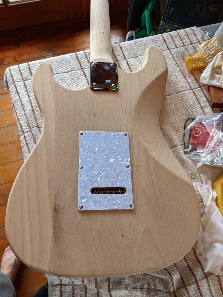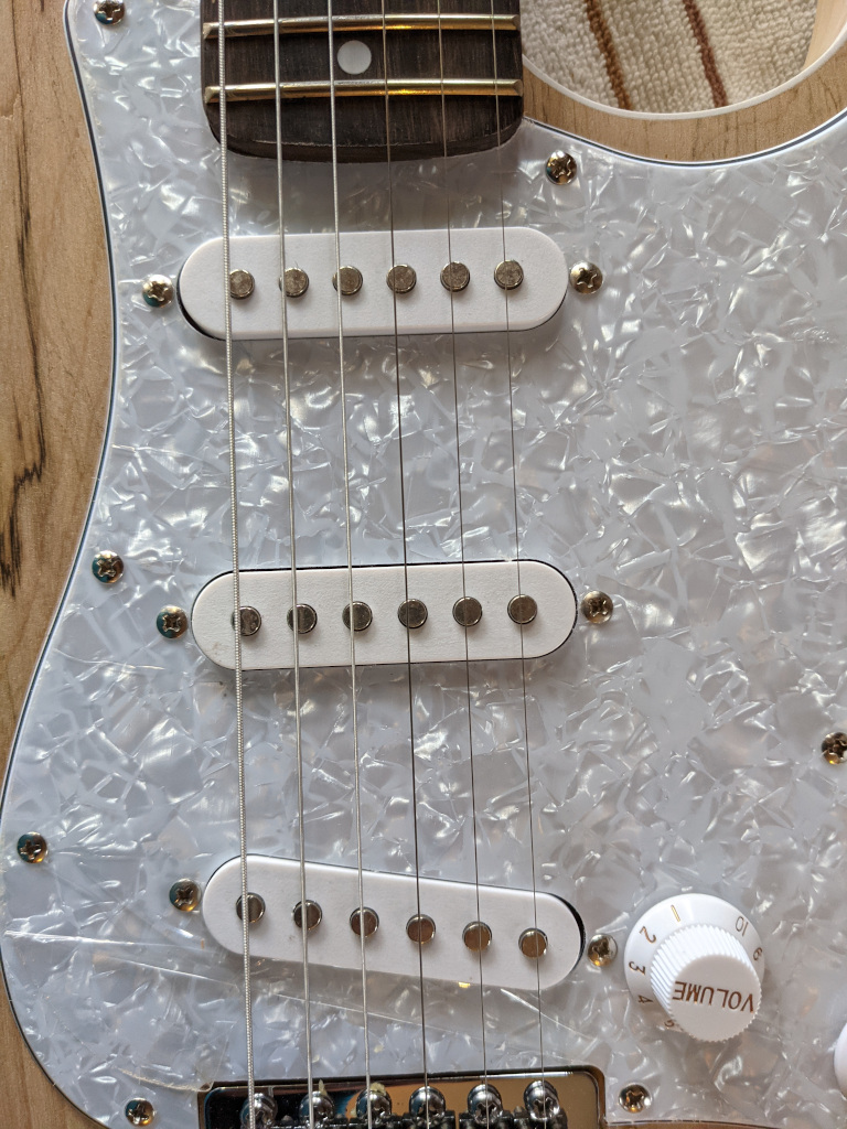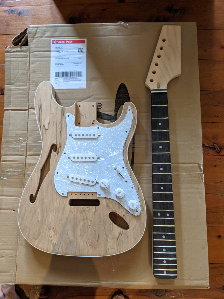 I originally ordered a thinline TL with spalted veneer and white binding, but there were none in stock and none on the horizon, so I was talked into the same specs but in a ST. Upgraded to Grovers and Tonerider Classic Blues set. Will get some better quality electronics at some point before I put it all together.
