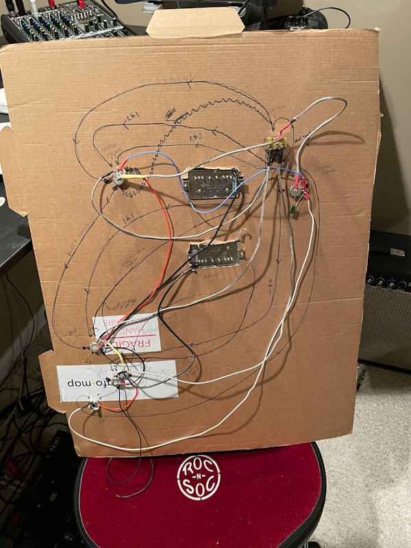 With small wire run and grounded them to back of pot. Still got the hum. Aargh. My multimeter (set at 200ohm reading) reads about 1.0 or 2.0 when I touch the probes. Ground solder point to ground solder point across the wiring reads from 1.0 to 4.0. Seems within reasonable range?? The hum shuts off when the master tone is pushed to either end of its range? Is that a hint to where to go next?? Thanks for any suggestion!!