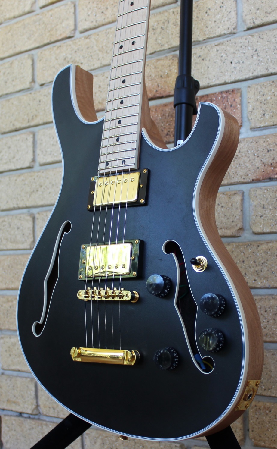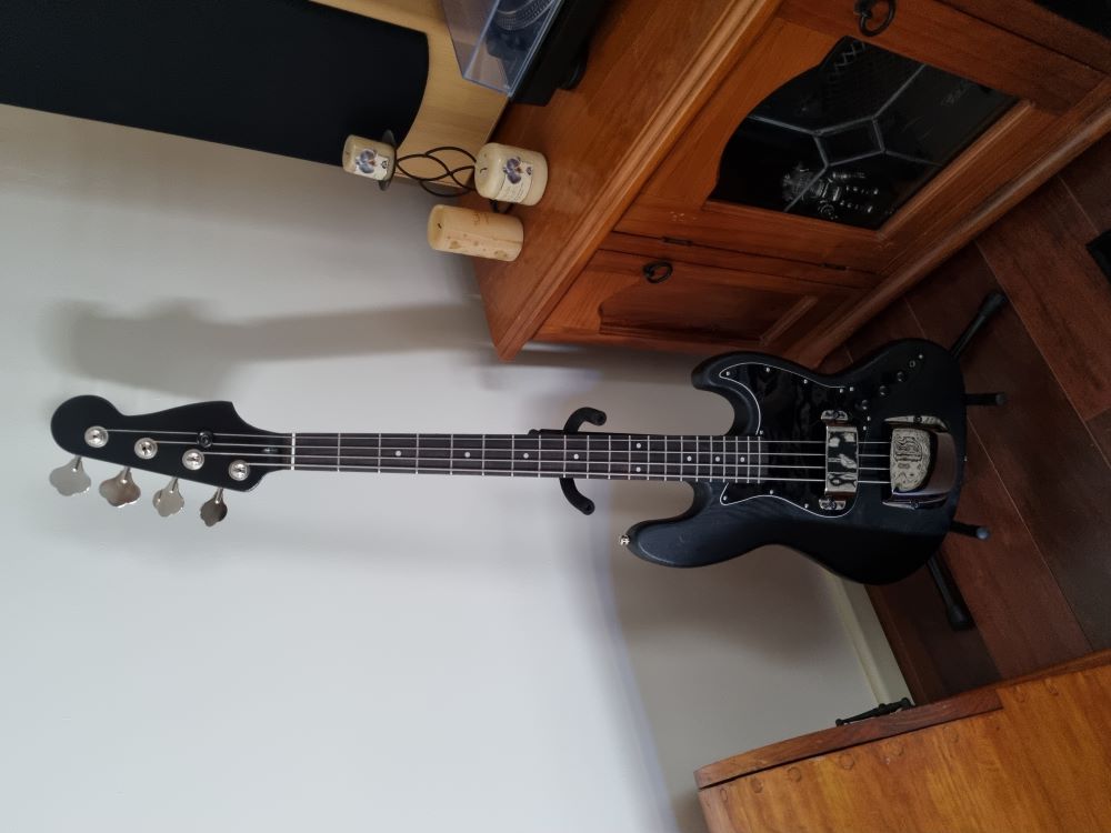 This my contribution, finished this a couple of weeks ago. Not the shiny sparkling body but a bit more of a gothic approach without going overboard. JET BLACK is an Indian ink option I chose as apposed to the high gloss. The neck I used an Ebonising stain using fine grade steel wool and soaked in Vinegar for a couple weeks, the body and neck were then spray in a Saturn clear. A few up grades, Tone rider jazz pickups, eagle tuners, bone nut, Schaller strap locks, chrome bridge and neck pickup covers. Low action plays great, a little heavier with the Ash body and the bling but sounds just fine and plays nicely. Click image for larger version.