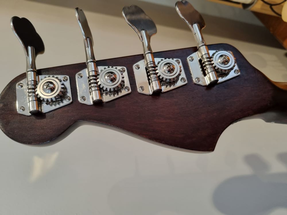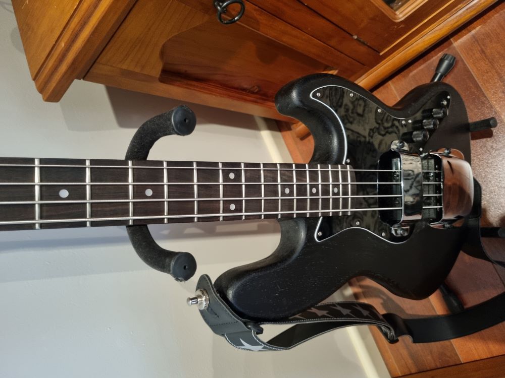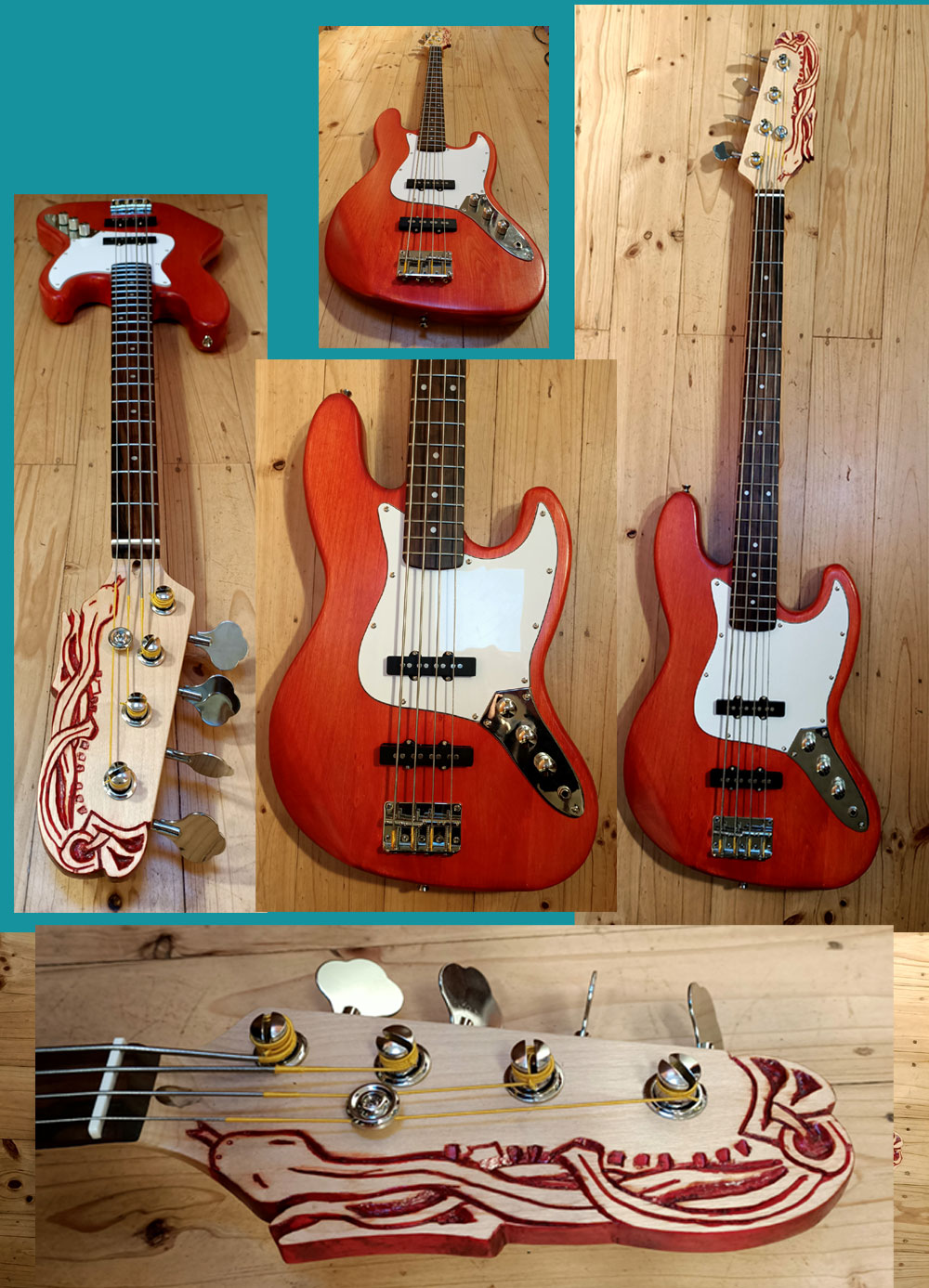 A Jan 2023 entry perhaps? (I can't compete with Benjh96's beautiful guitar!) Body was many many layers of dingo red stain, and blue/ red oil paint mixed with more jara stain. Neck is handploy finish over a carving using celtic eagle intertwined with a snake, grooves filled with oil paint/ stain mix then sanded back to clean up edges. Went with flatwound strings to differentiate from my other bass. Very nervously adjusted neck and internation. Sounds excellent
