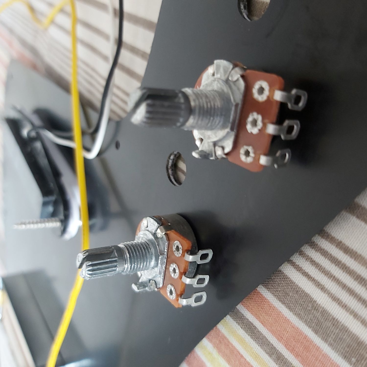 Looked at fitting pots to pickguard. Has anyone seen pots like those shown? What is the small lug to the left on top of the base of the pot? Never come across this before. Naturally the pots will not sit flush with the pickguard. Very strange. Presumably these lugs have to be removed?Click image for larger version.