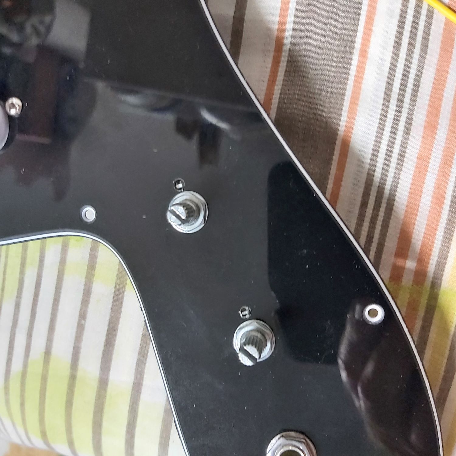 Thanks Trevor. Took for me the easier option and drilled two 2.5mm holes in pickguard and fitted pots flush. Next stop wiring.