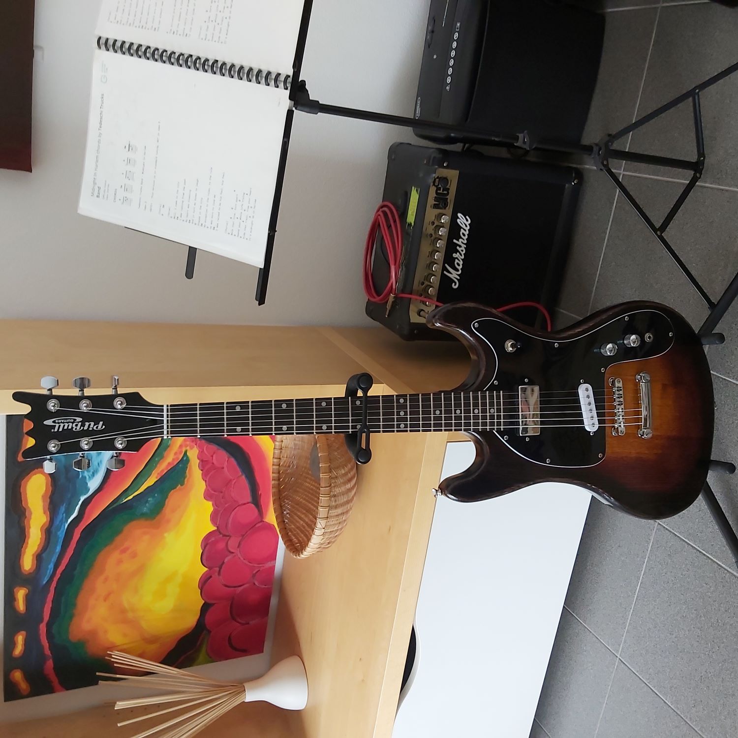 Did the final solder; attached pickguard; hammered in four posts; assembled bridge etc; strung it up; set it up; tuned it then had an hour playing to my satisfaction! Hope you like the finished product!Click image for larger version.