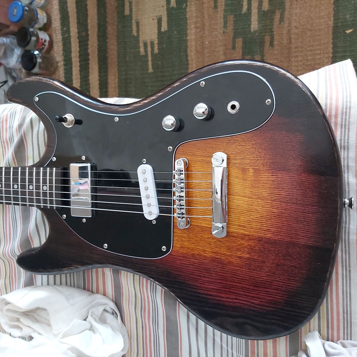 Managed to fit in a good two hours soldering this morning, wiring to everything on the pickguard. Only thing outstanding is fixing bridge post earth to tone pot, then I can start to assemble. Have given body about ten coats of Truoil with a light sand of 0000 steel wool between coats.
