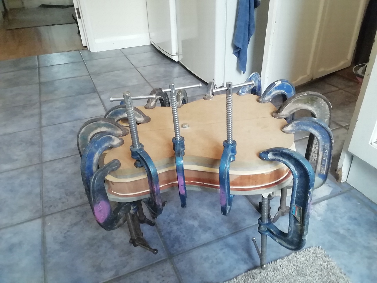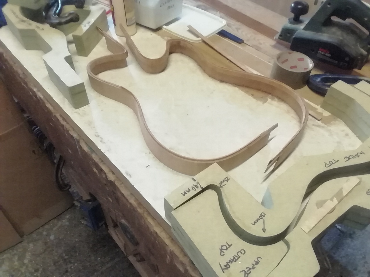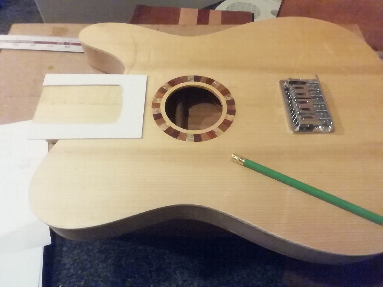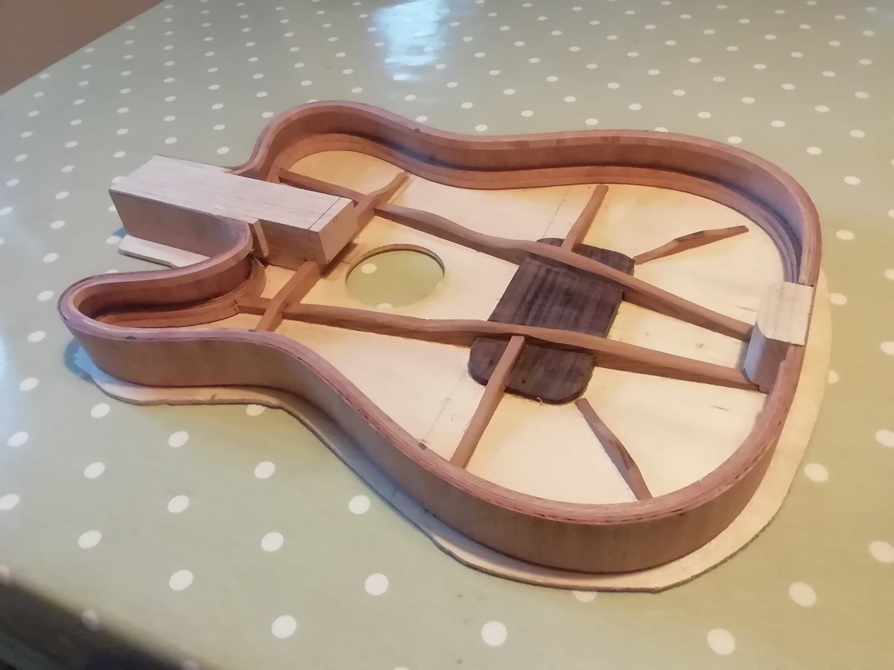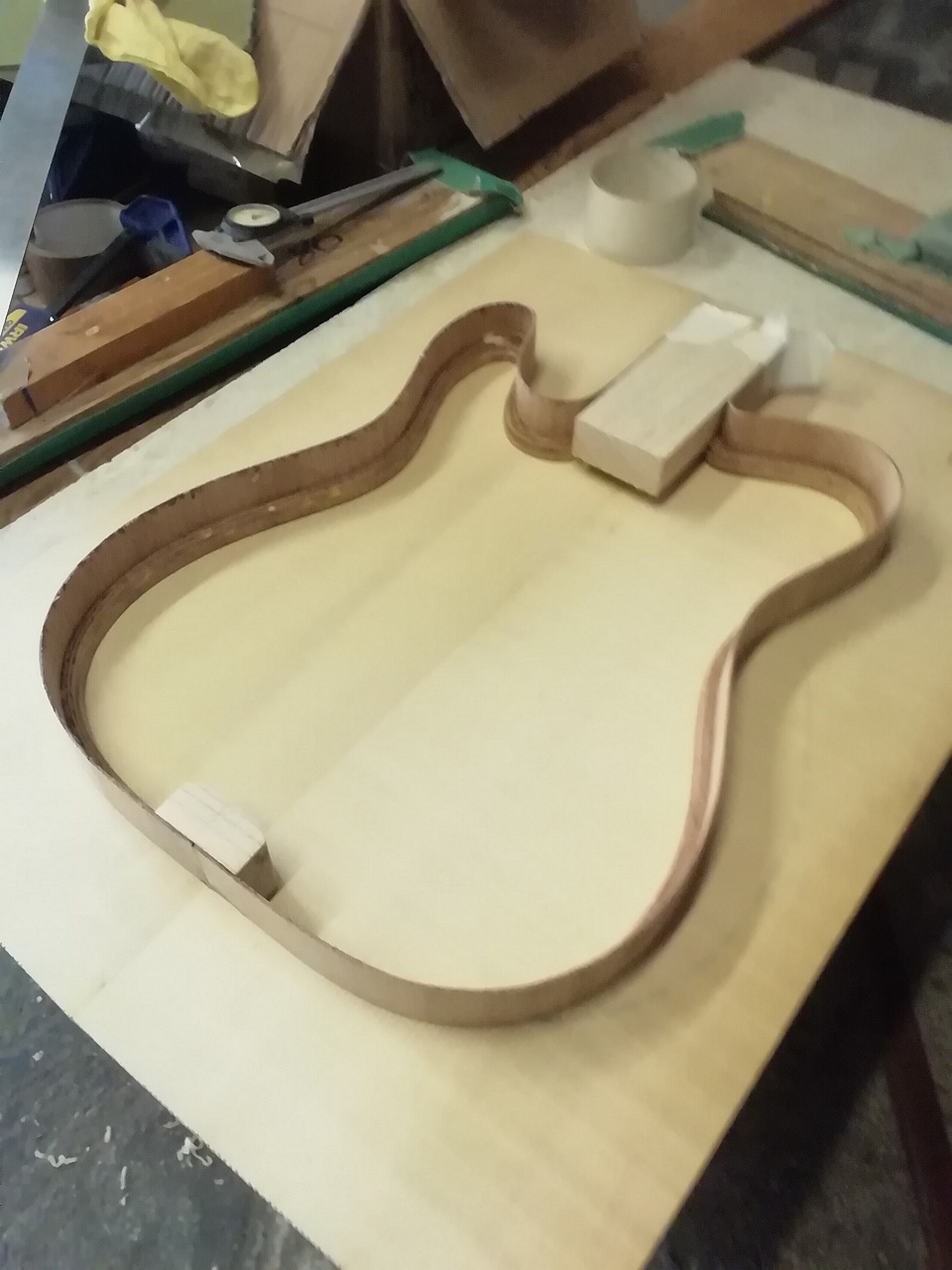 Haven't been here much for a few years. This is part of the reason. Its taken much longer than it should have. A mix of fun and frustrating. The biggest problem is I often had to leave it weeks between build sessions, in which time the timber would warp! Maybe I should stick to solid bodies.
