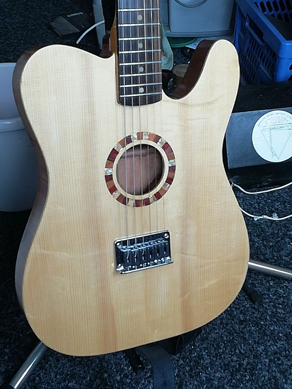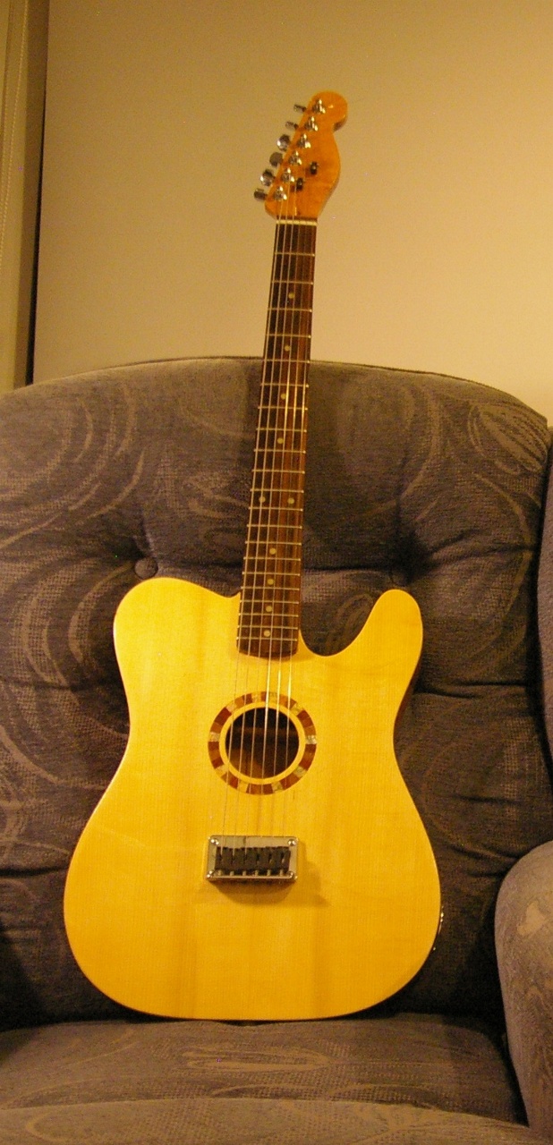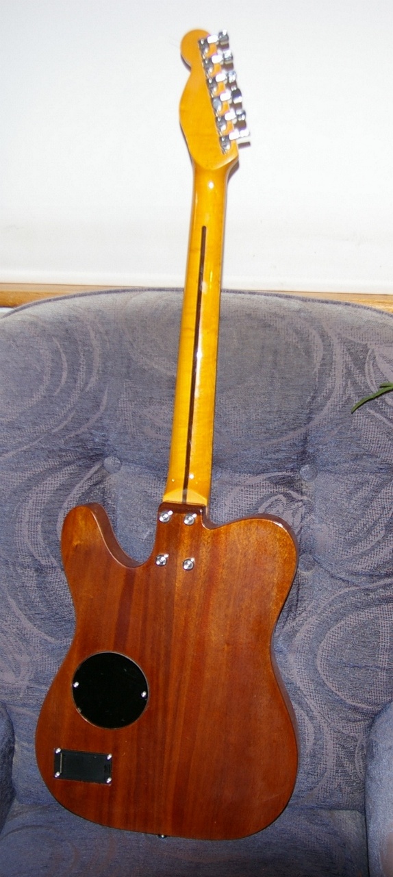 The body is, obviously, all mine. The top is spruce from the local luthier supply shop. Bracing is all cedar except for the bridge plate, which is rosewood. The sides are 2mm meranti plywood, and the back is sapele from a boat I bought 40 years ago! The neck is a stratocaster copy secondhand from Simon, but I altered the headstock to make it more telecaster like. The finish is tru-oil.