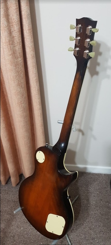 Color is a modified mahogany, neck decal is gold gilded. Top coat finished in clear cut and polished.