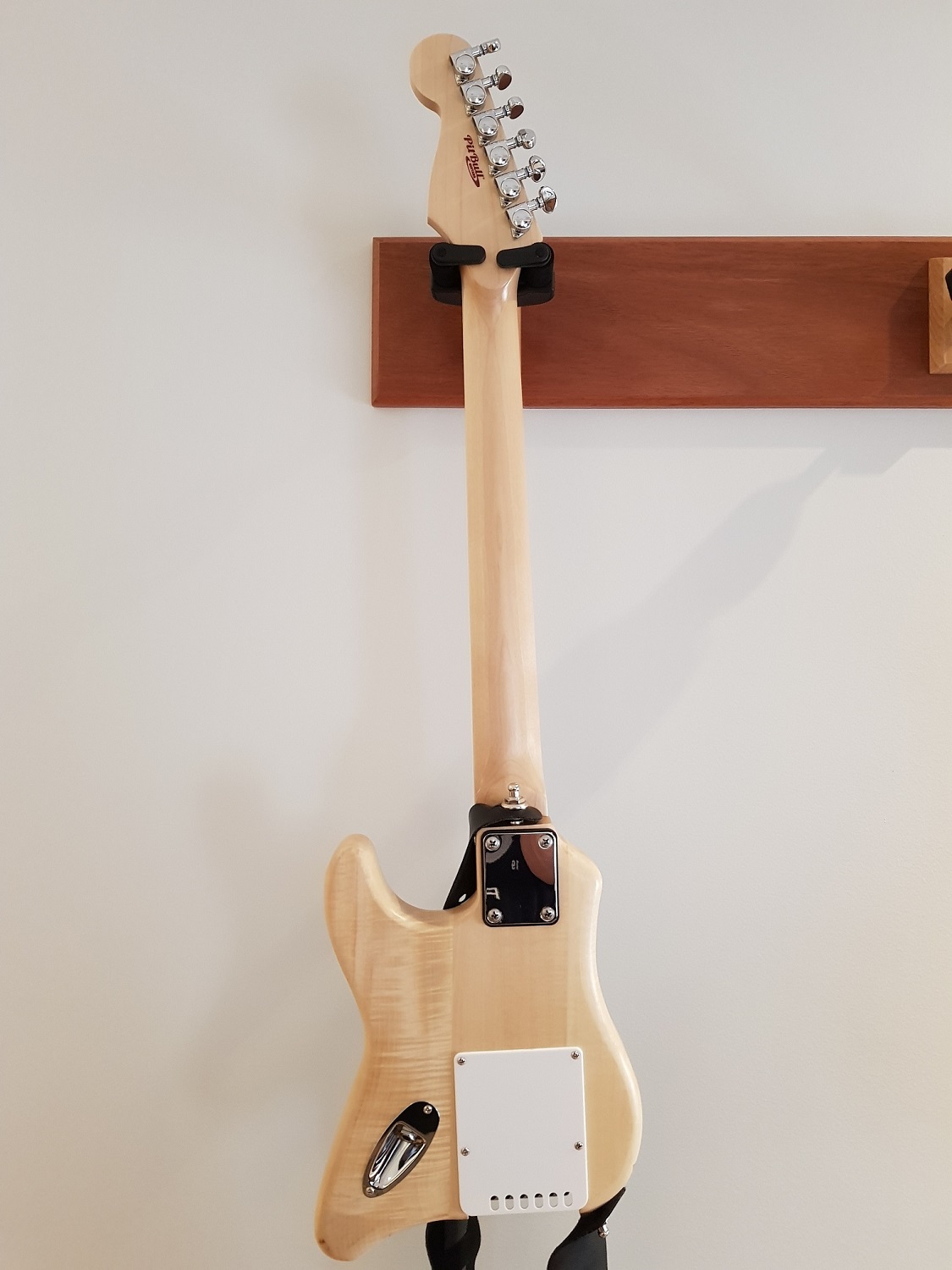 Not really a build thread as I didn't take a lot of pics along the way but I thought some might be interested. I work FIFO and motel rooms at site. The lockers provided are only 900mm deep. Ive been squeezing a short scale Harmony Bobkat into the locker but being a 1961 guitar in an original cardboard case its not surviving too well. I liked the idea of the pickguard strats so this is my own take on that theme. Total length is 890mm, could've done 3 a side tuners and saved a bit more but I like this headstock shape.
