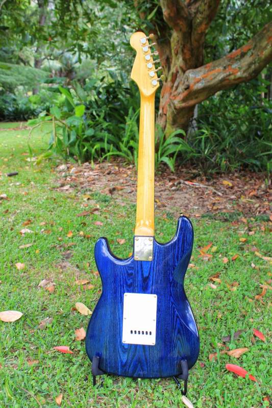 Here is my STA-1 finished in blue Colortone dye with Ebony Timbermate grain fill. The clear coats are White Knight gloss acrylic. The hardware is all PBG stock, but with the gold hardware upgrade kit and white pearloid pickguard.