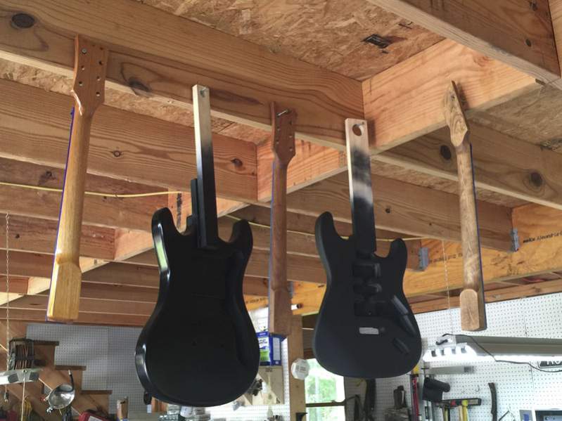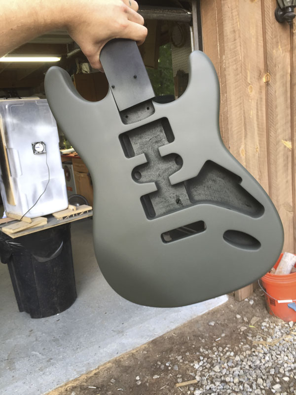 We have two Mk-2's in process , one to keep and one to use as a promo giveaway. . We used Duplicolor lacquer for the base and 2k clear (awesome stuff!) on the Mosrites. The Strat was off the shelf Camo paint, in fitting with our theme. It's being cleared with a satin poly. The white one should be finished this week, the black one soon enough. I'll update the pics once I get the Photostream working again on my computer ;-)