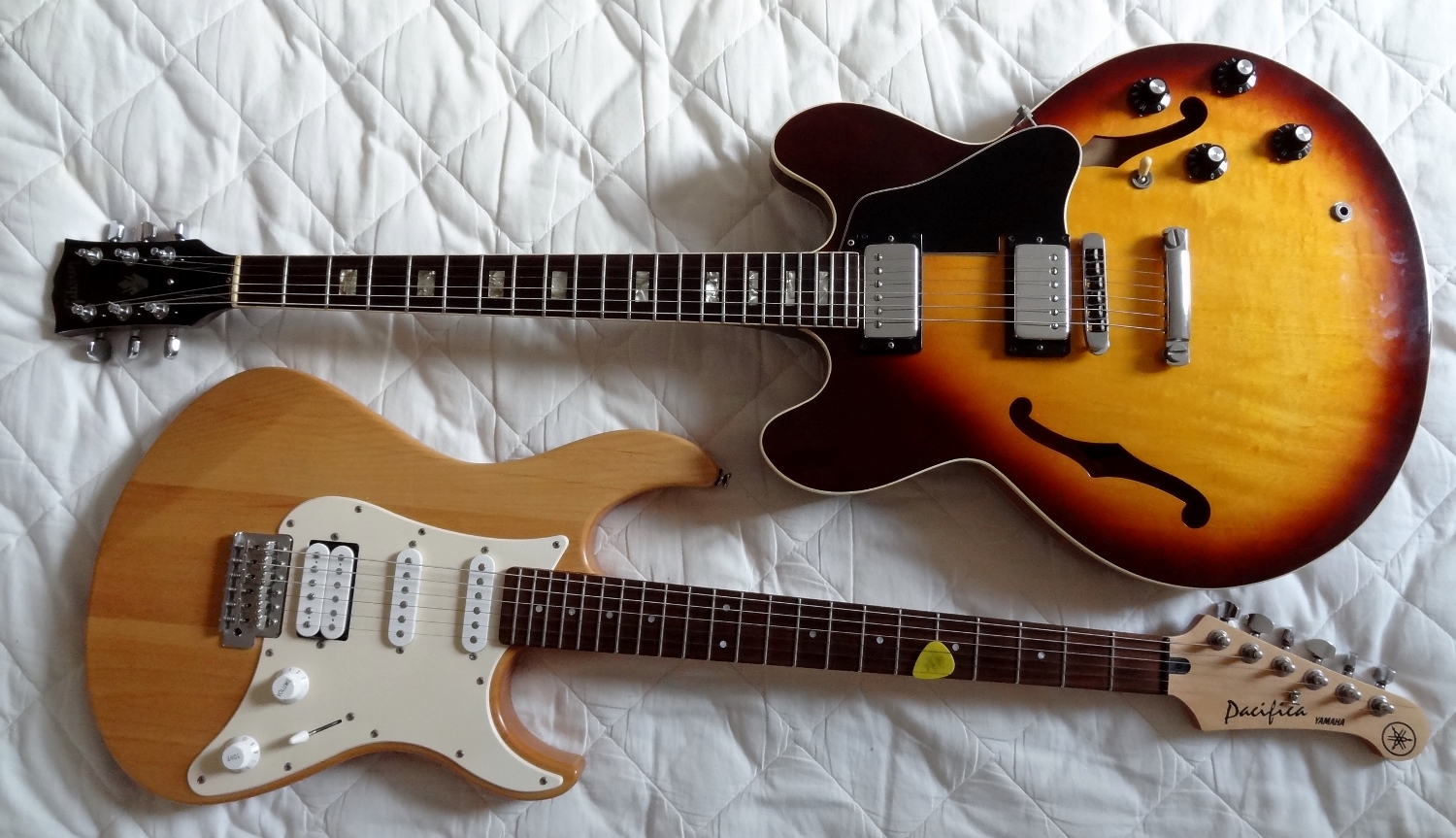 I have a treasured 1975 ES-335 that I have had for many years, I also have two young kids. I wouldn't want the 335 and the kids to interact in an unpleasant way, so a few years ago I bought a used Yamaha Pacifica from Crime Convertors for $150. Incredible value for such a nice playing guitar and I can afford to not be precious with it. It lives on a stand for easy access, for me ….and the kids.