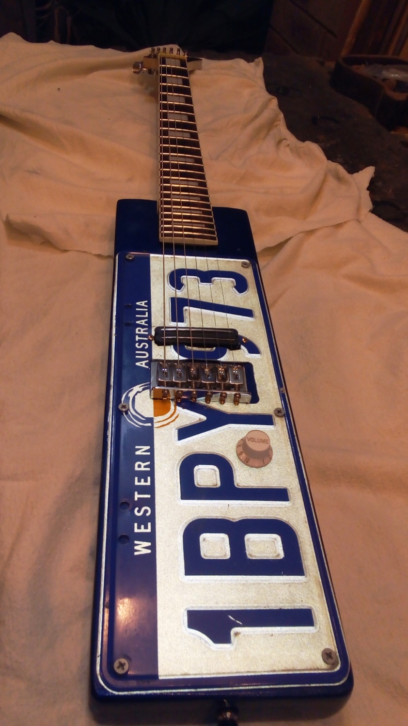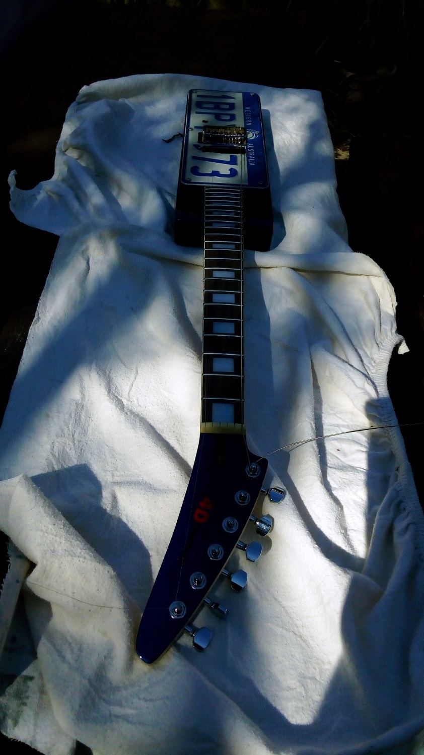 Here's some pics of the assembly process, got the bridge and neck screwed in. Will disassemble and give it a good polish then do the wiring. Pickup is a single hot rail which I will coil split with a push pull pot. Just 1 volume straight to the jack. Sorry I didn't really do a build diary. Body is pine scratchy, Mica blue metallic paint, neck scored from Ads is from a PBG1 kit, love the block markers and banana shaped headstock really suits. Not many axes I know that can sit on their side. Might loan it to DB for the next cricket match the shape suits a cricket bat more than a Mosrite haha