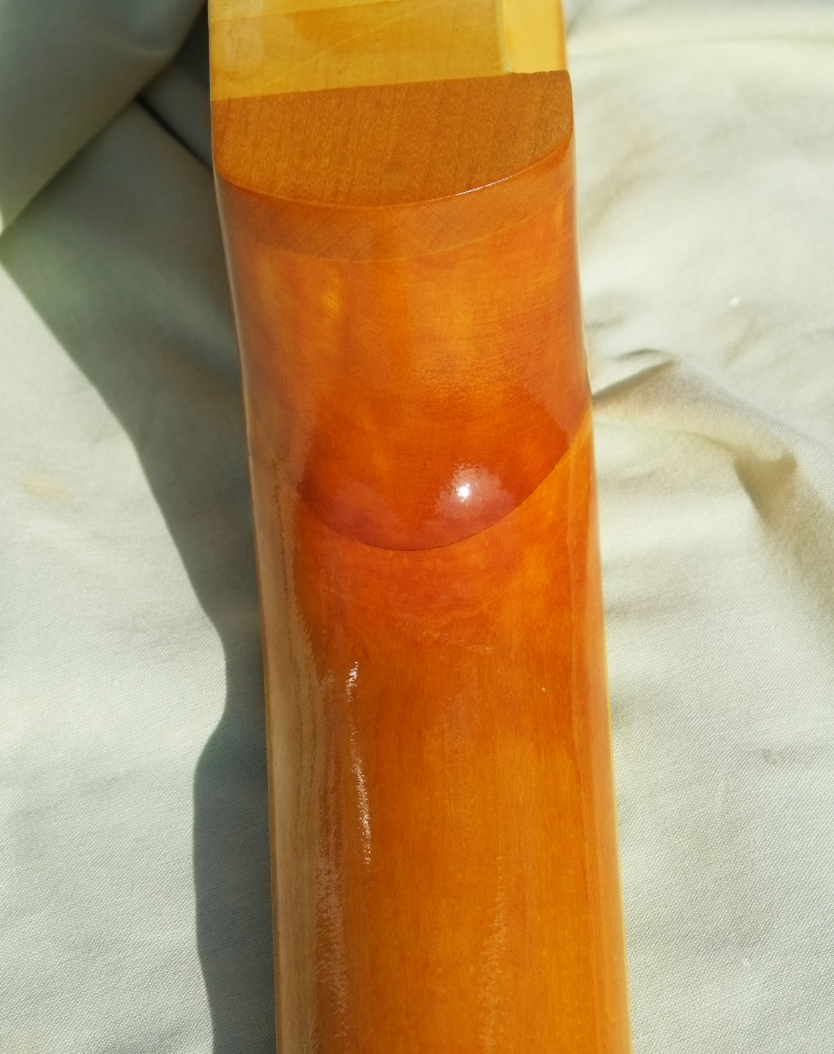 The guitar now had to wait a few days for the lacquer to harden enough so that I could sand it down to a nice flat finish. After a good deal of wet sanding, there were still a few areas where there were still small dimples. Not wanting to start sanding through to the amber lacquer, I filled these areas in with clear lacquer using a small brush, sanded down, and repeated until I knew the guitar was nice and smooth with no glossy dimples showing up under an oblique light.