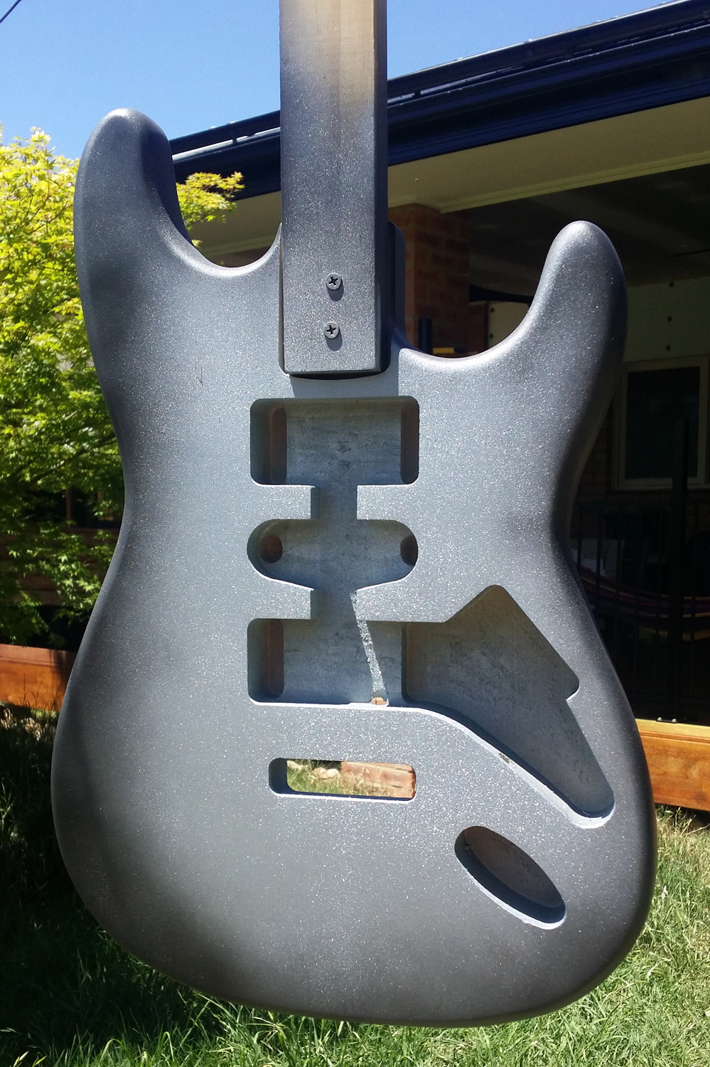 So after a couple of weeks of raising grain, sanding, filling, sealing, priming, I sprayed a couple of layers of the sparkly silver. I'm pretty happy with the coverage - it was pretty fiddly work. The metal flecks clog the nozzle pretty frequently, so I ended up in a routine where I'd spray for 5-10 seconds, then dunk the nozzle in some metho, swirl it around, shake it off, and spray again.