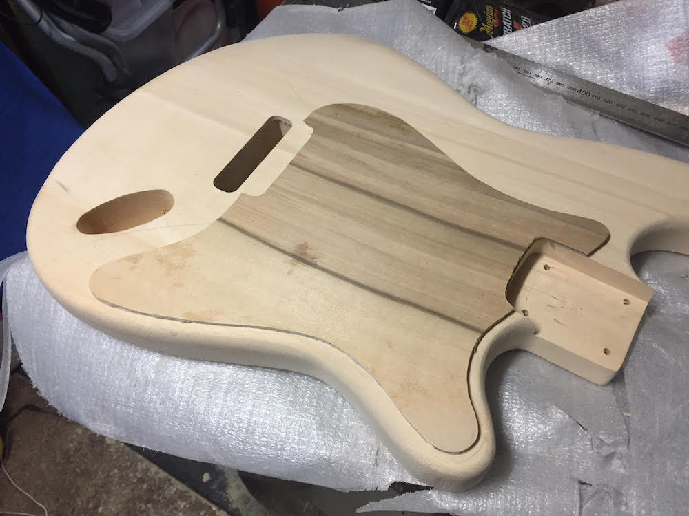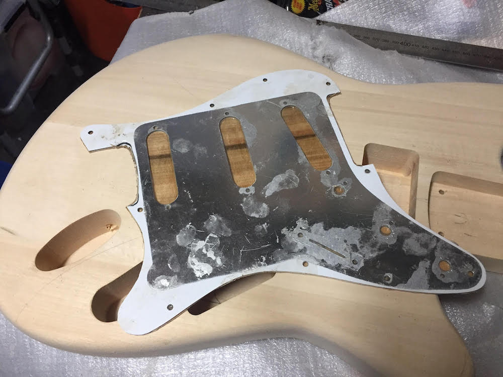 The biggest challenge at the moment is what to do with the pickguard. As mentioned I can’t use a standard strat one as I’m only using two pickups, and I’m also thinking about filling in the jack rout and plugging in through the pickguard. I didn’t particularly enjoy making a new one for the last build, so I’m looking for a different approach. I also want to paint over the pickguard (I’ve now decided the body won’t be just a single solid colour) but I’m concerned about how the paint will take to the plastic of the guard. One option at this point is to get a very thin veneer and epoxy it to the standard pickguard. That way I’ll cover off the two challenges: paint will now go on to wood, and I’ll also be about to cover up the standard strat routs and holes in the pickguard that I won’t be using. I think it'll work but I'm still trying to dream up a different approach...